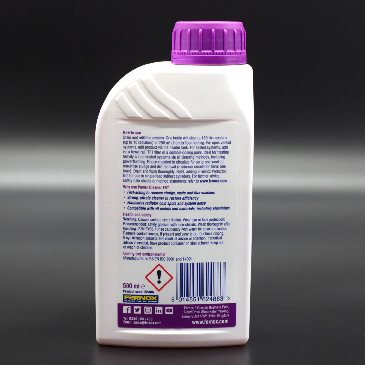 - Power Cleaner F8 is supplied in 500 ml bottles. Keep out of reach of children. Do not mix with other chemicals. For further safety information, consult the Safety Data Sheet (sds) Removes sludge, limescale and corrosion debris Non-acidic (pH neutral), non-toxic & non-foaming