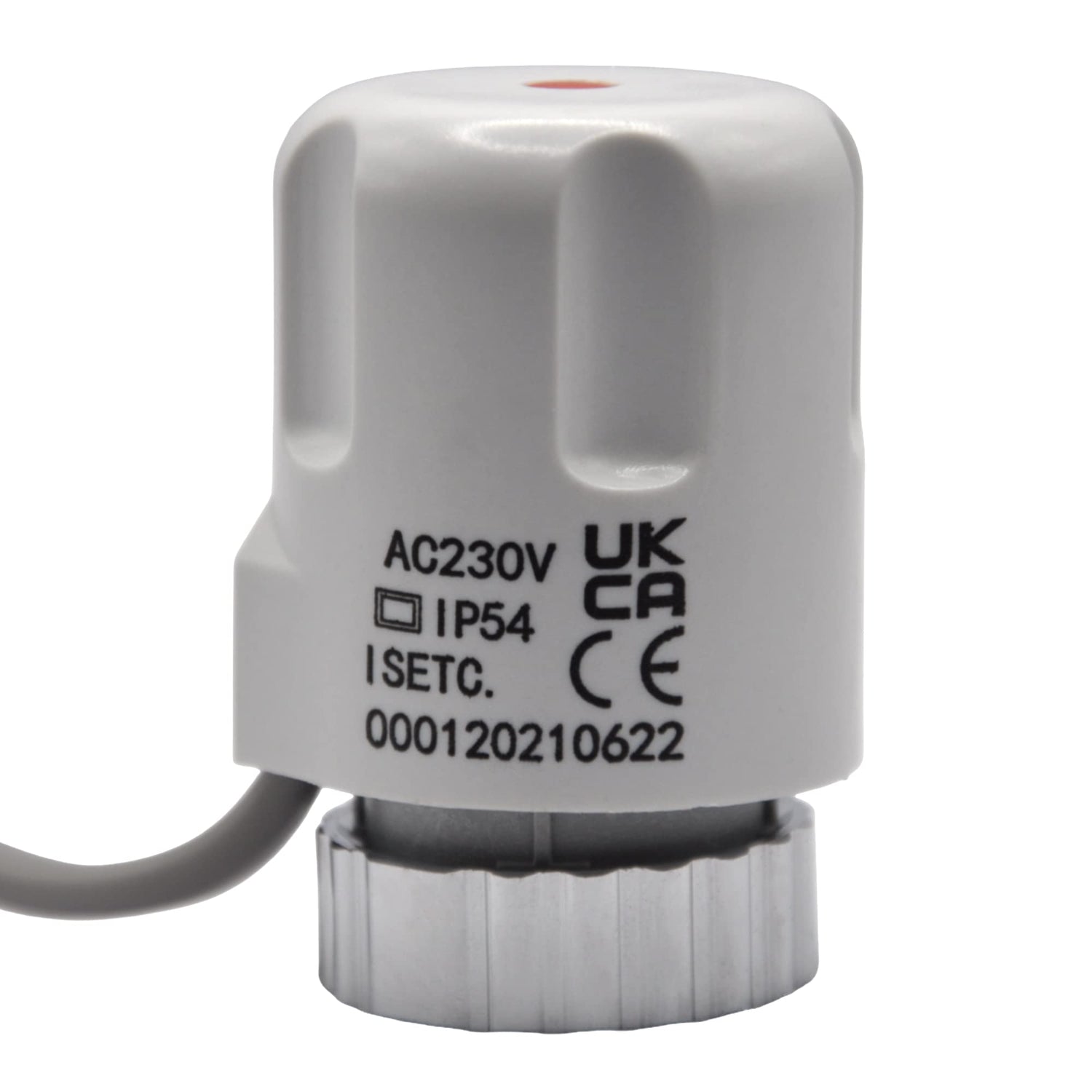 - It is powered by a 230v AC supply and uses a low voltage signal to operate the valve, The actuator is connected to a thermostat or a control system that regulates the temperature of the underfloor heating system.