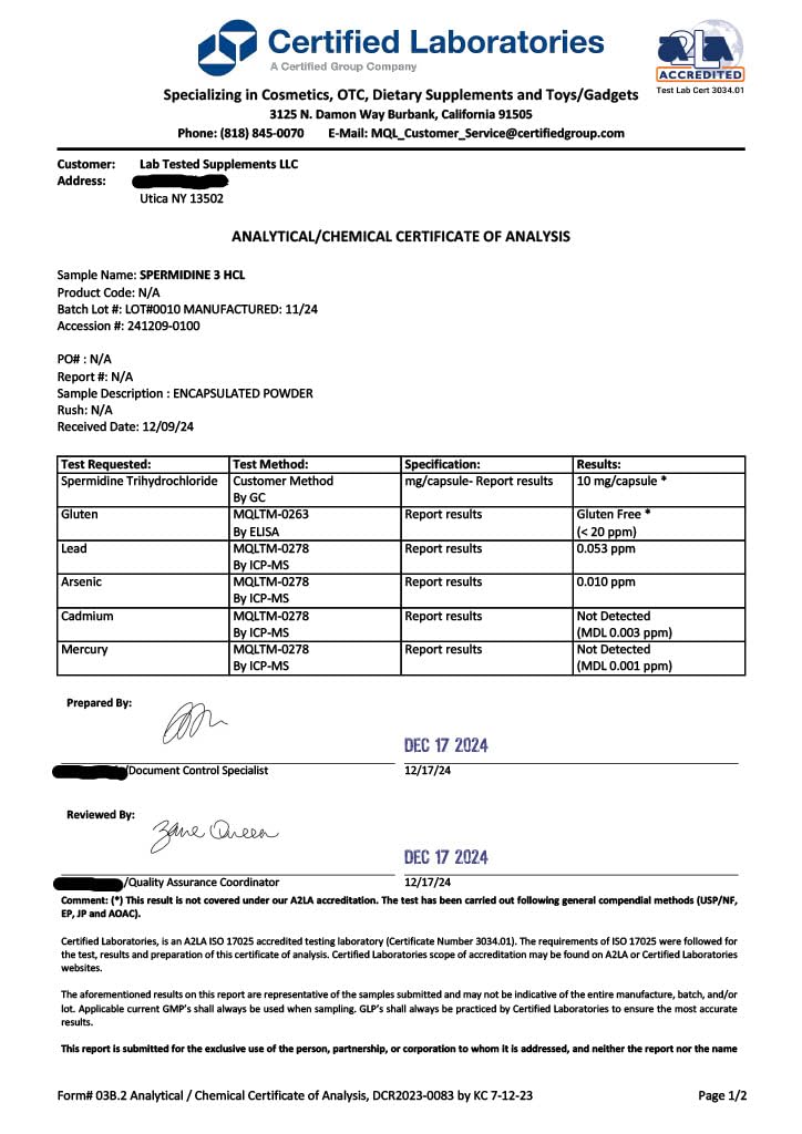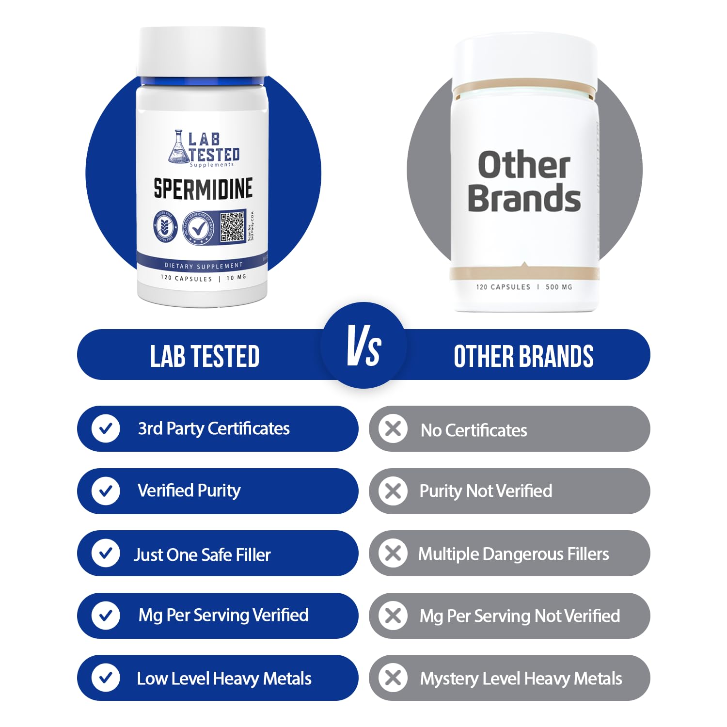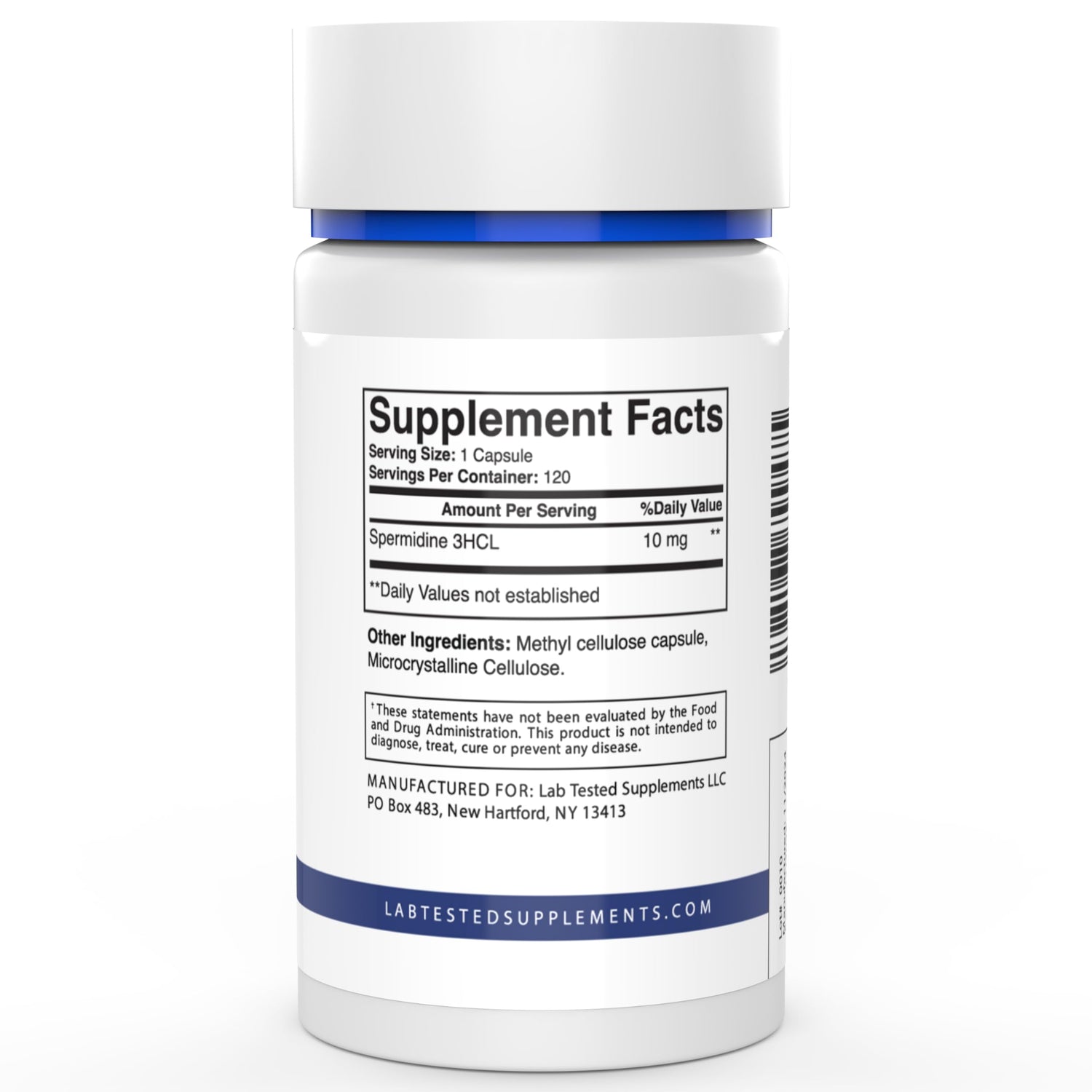 Lab Tested Supplements - Spermidine 3HCL Supplement - 120 10mg Capsules - 3rd Party COA's provided with Every lot# - Spermidine Trihydrochloride