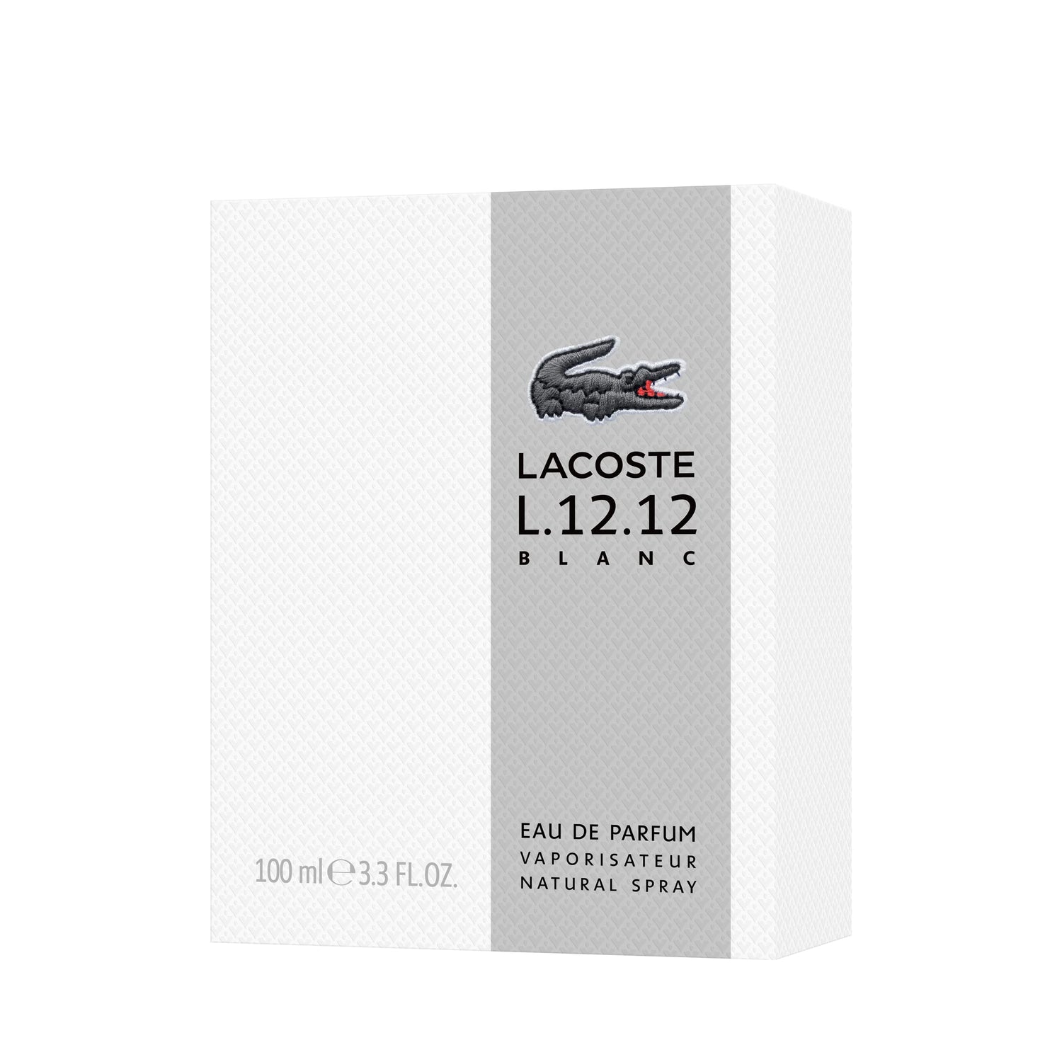 - L.12.12 Blanc Eau de Parfum, inspired by the iconic Lacoste polo shirt, reveals a confident masculinity in a woody aromatic scent. Zesty finger lime and eucalyptus essence blend with powerful pine and cedarwood, culminating in an intense sense of comfort.The bottle and outer pack feature the iconic ‘petit piqué’ pattern, reminiscent of the polo fabric. To signify its more intense Eau de Parfum concentration, the bottle is adorned with a dark grey embroidered crocodile patch.