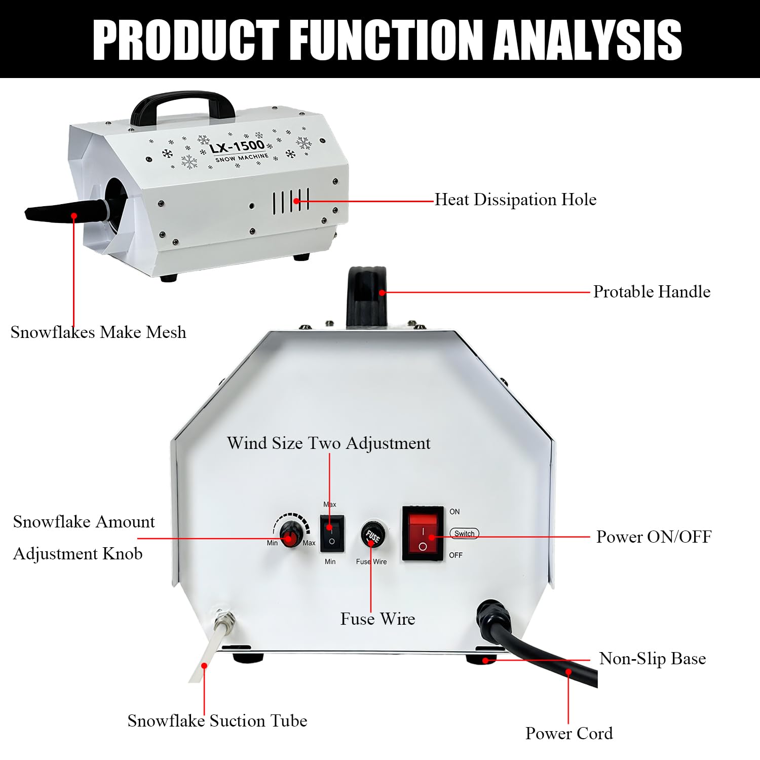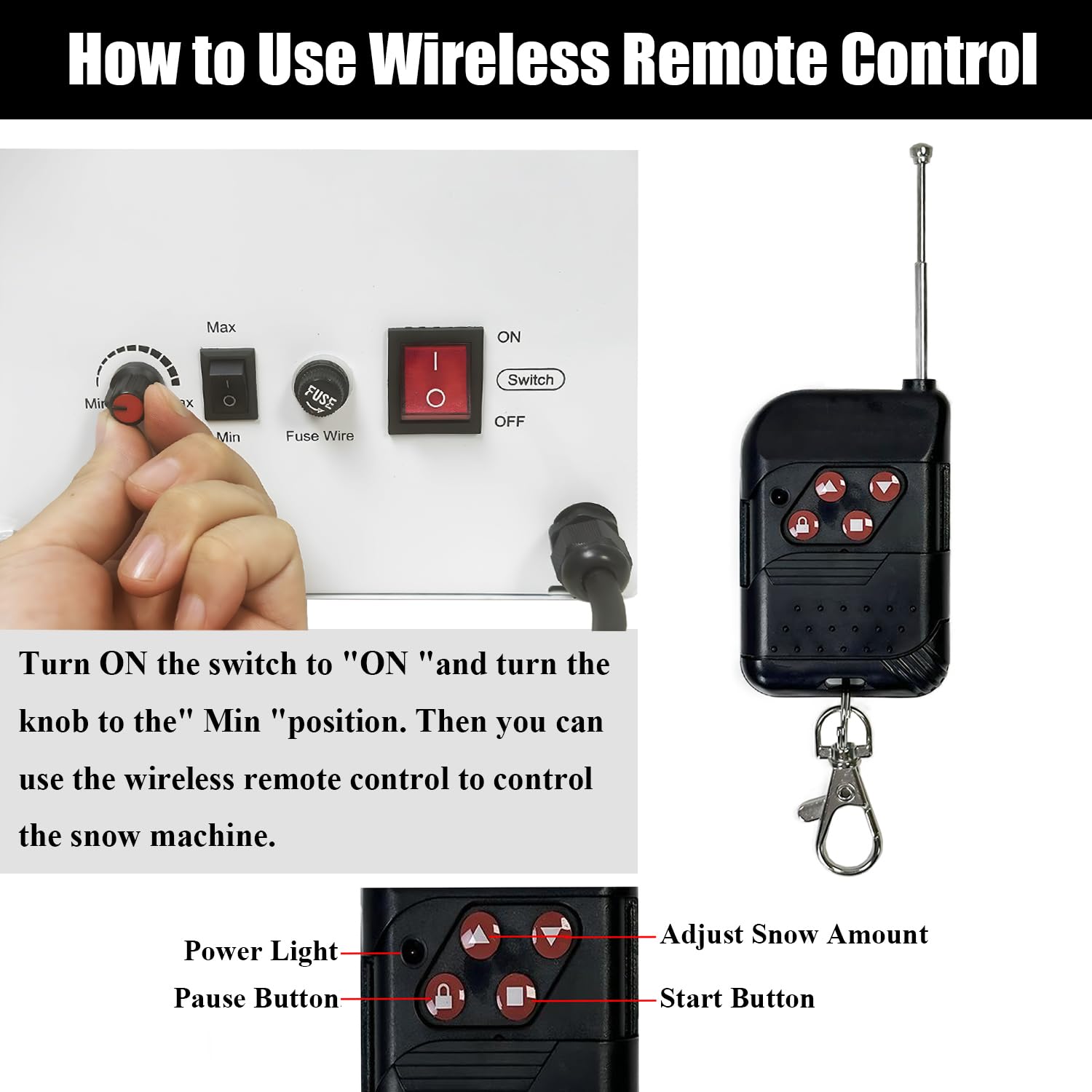 - 2 Ways to Adjust Snow Size: You can adjust the amount of snow and customize the size of snowflakes either by the knob on the machine or the buttons on the remote control. Meet the needs of your scene or activity, ensuring a perfect snow effect. The machine also has 2 levels of wind speed adjustment to control the snowfall distance.