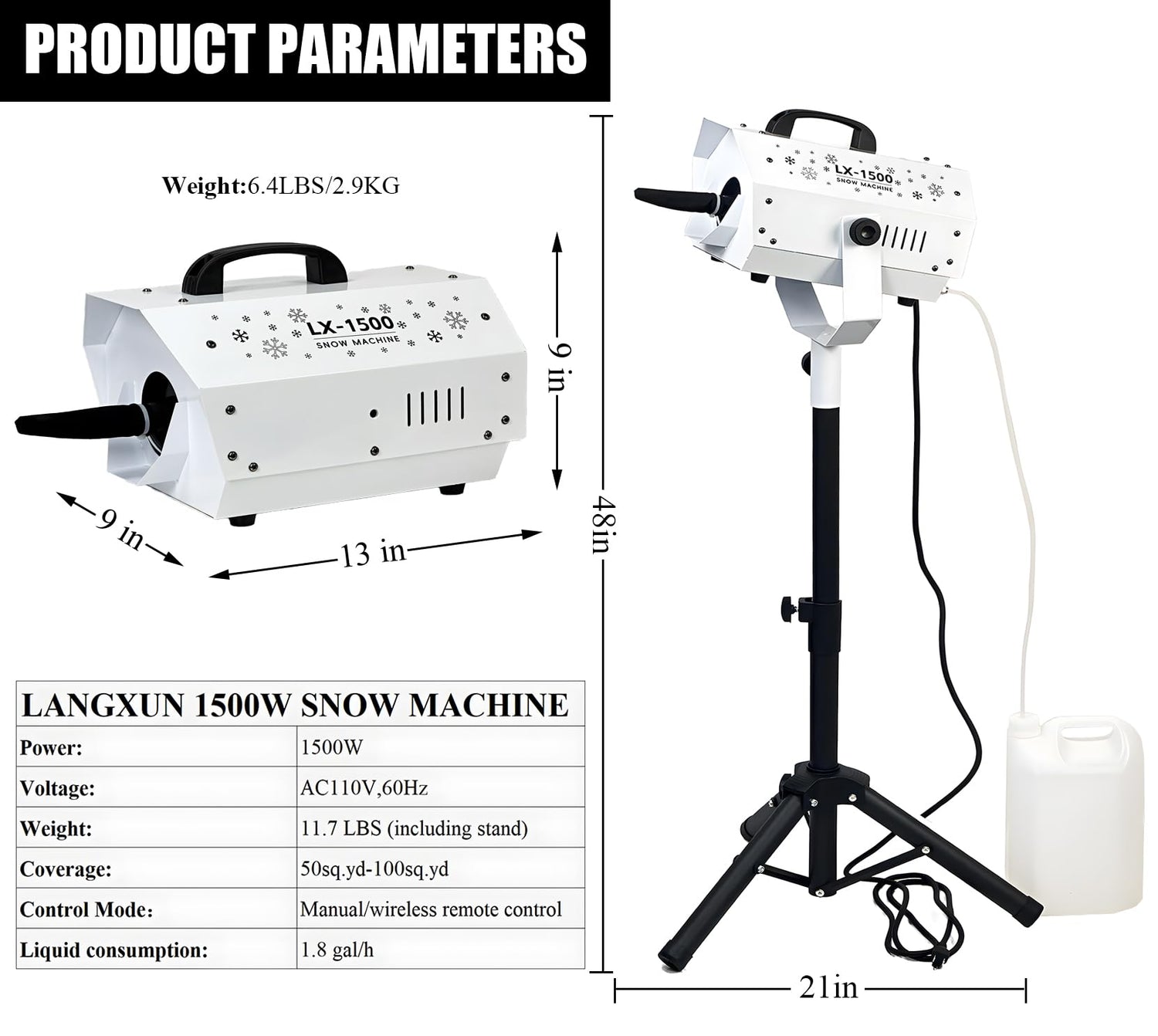 - High Power: 1500W of power to meet various commercial and party activities. Comes with a professional tripod stand and a 1.4 gallon snow fluid tank to extend usage time. Perfect for creating indoor and outdoor snow effects.