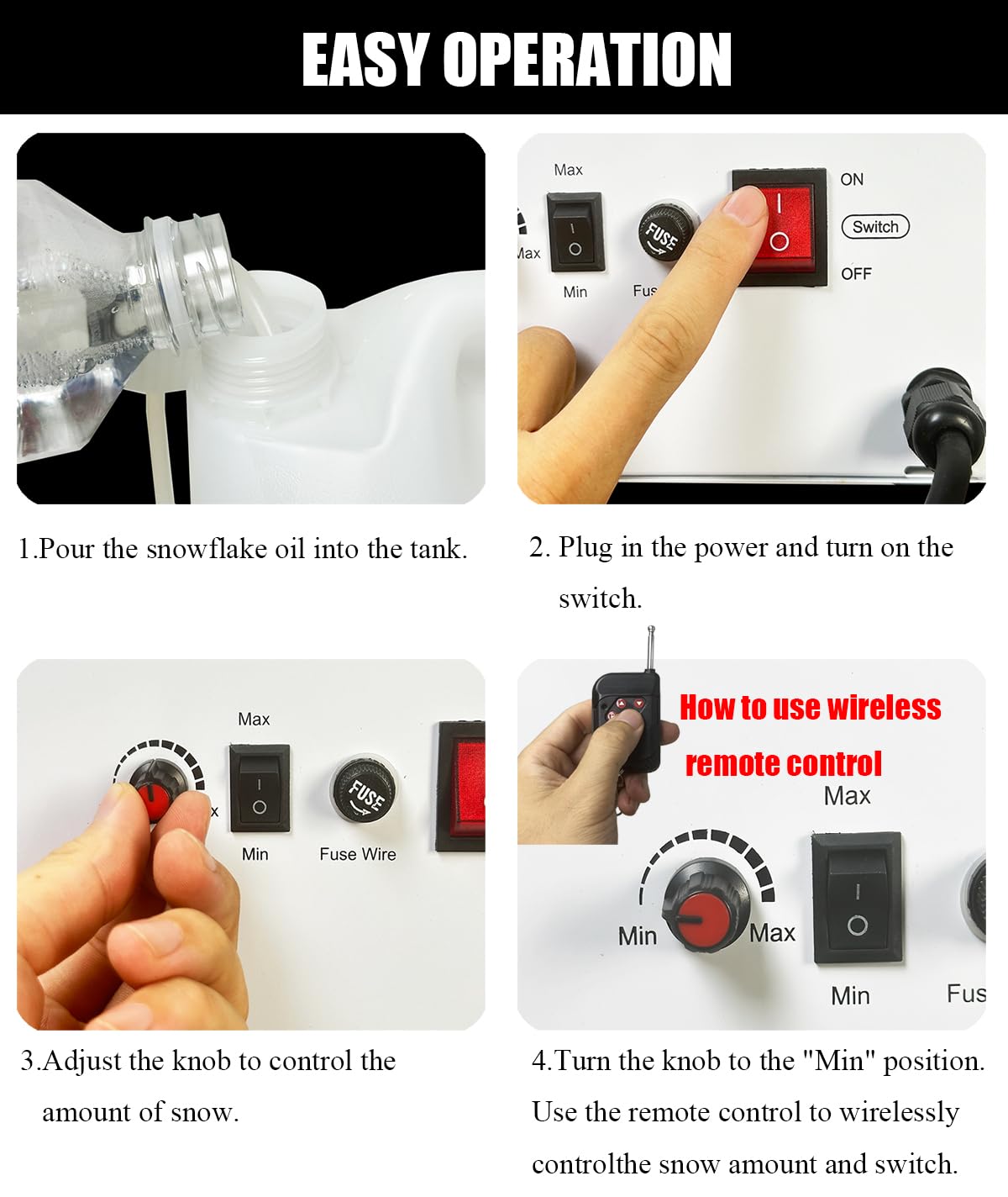- Easy to Use: Simply pour in the snow fluid(2 bottles of concentrated snow fluid are included, which can be mixed to make 2.4 gallons of usable snow fluid. ), then turn on the snow machine switch to manually control or use the wireless remote control to create snowflakes. Anyone can quickly learn how to use it.
