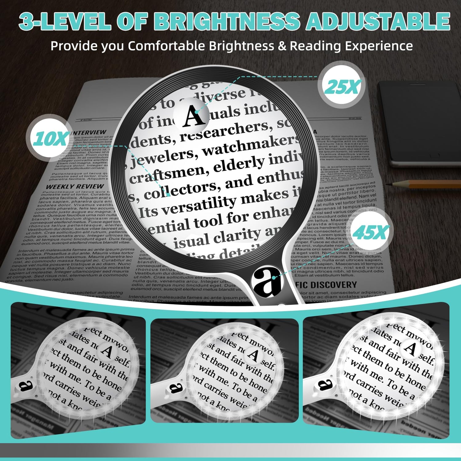 Large Magnifying Glass with Lights,10X 25X 45X Handheld Lighted Magnifier, 5.5in Page Magnifier 36 LED Lights, Magnifying Glass for Reading Small Prints & Low Vision Seniors with Aging Eyes