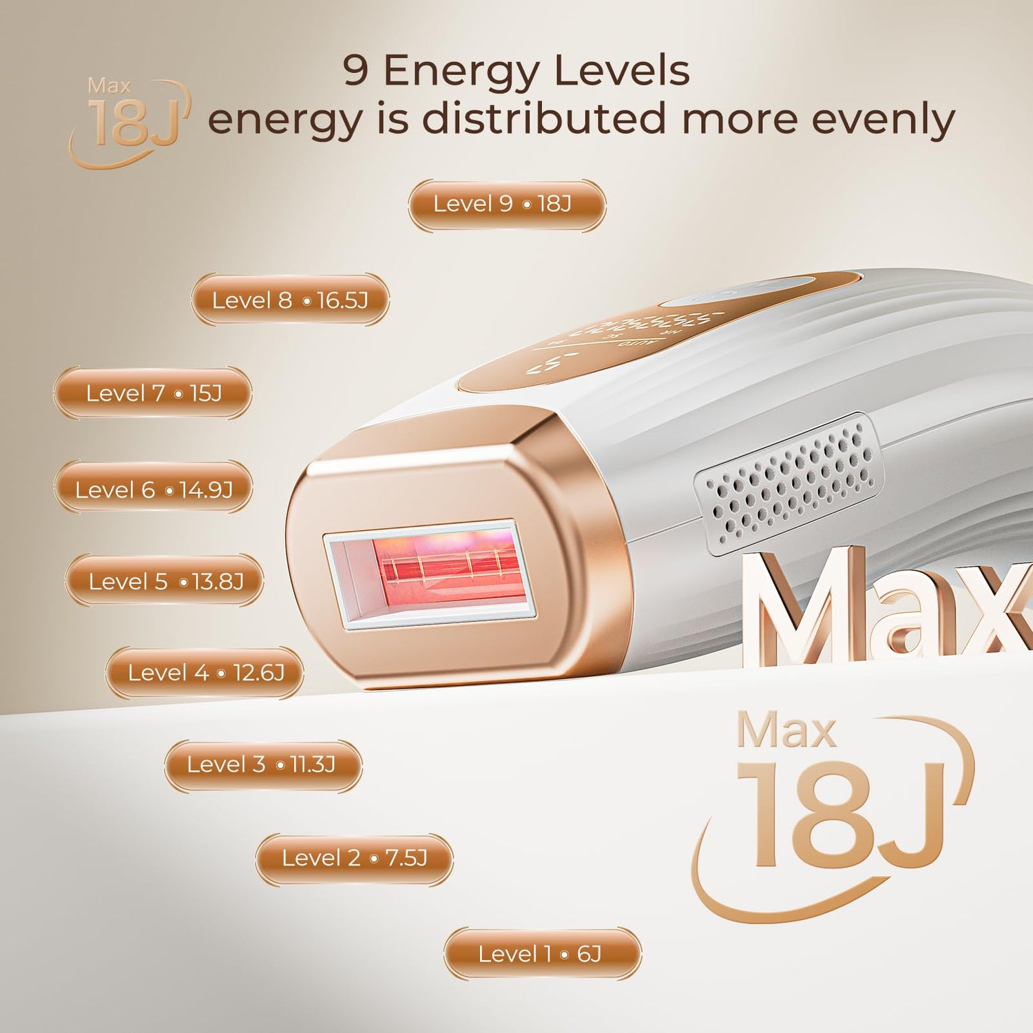 - 9 ENERGY LEVELS: The IPL hair removal device has upgraded 9 adjustable energy levels that you can adjust suitable energy level to satisfy your demands on hair removal and 18J energy is distributed more evenly to accommodate different skin and hair removal areas. The higher the energy level the better the hair removal effect. For the first time, please start from 1 st level, and then adjust the level according to the adaptability of your skin. The higher the level, the better the effect.