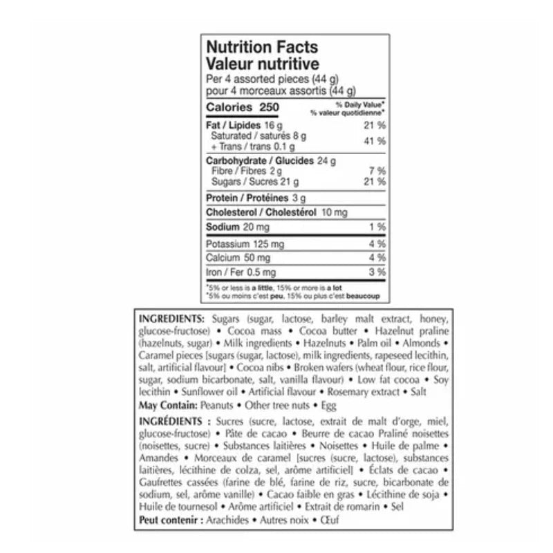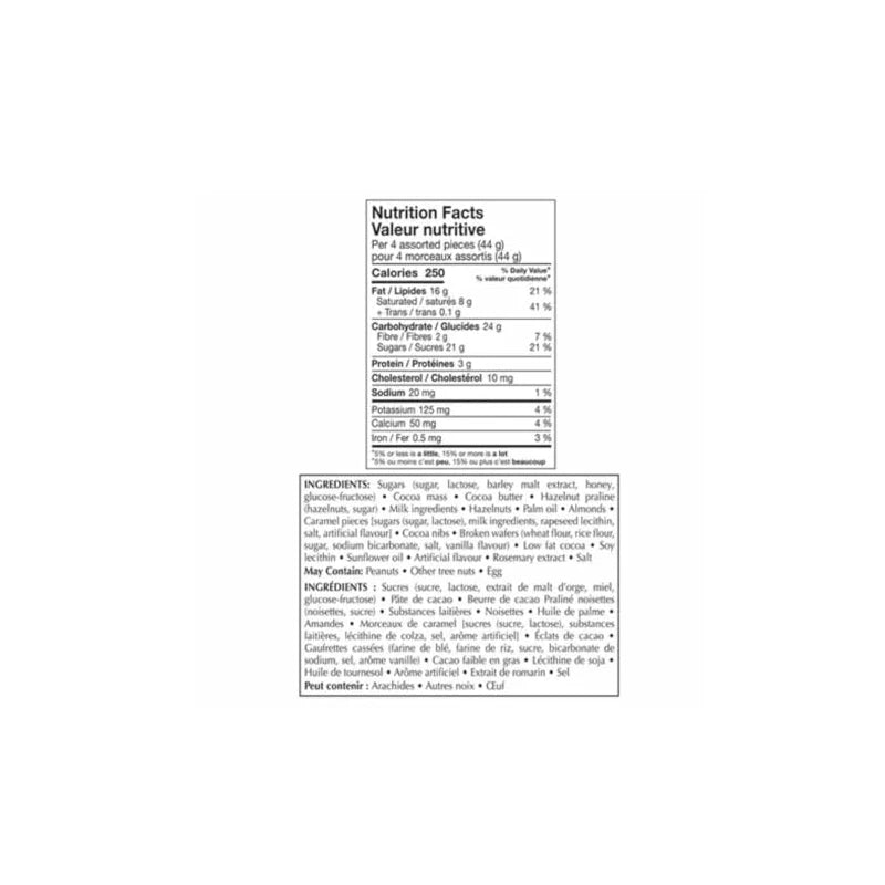 - Assorted chocolate flavours including: dark cluster, sweet almond, hazelnut gianduja, hazelnut cluster, crunchy praline, caramel cluster