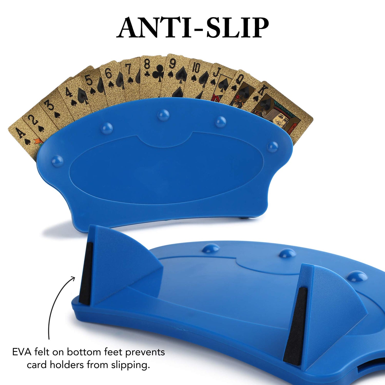 - DURABLE & ANTI-SLIP: Playing Cards Holders are made from PROP65 Certified thick durable ABS composite plastic in blue color; No-slip EVA felt grip inside to hold cards. No-slip EVA felt grip on the bottom to prevent sliding