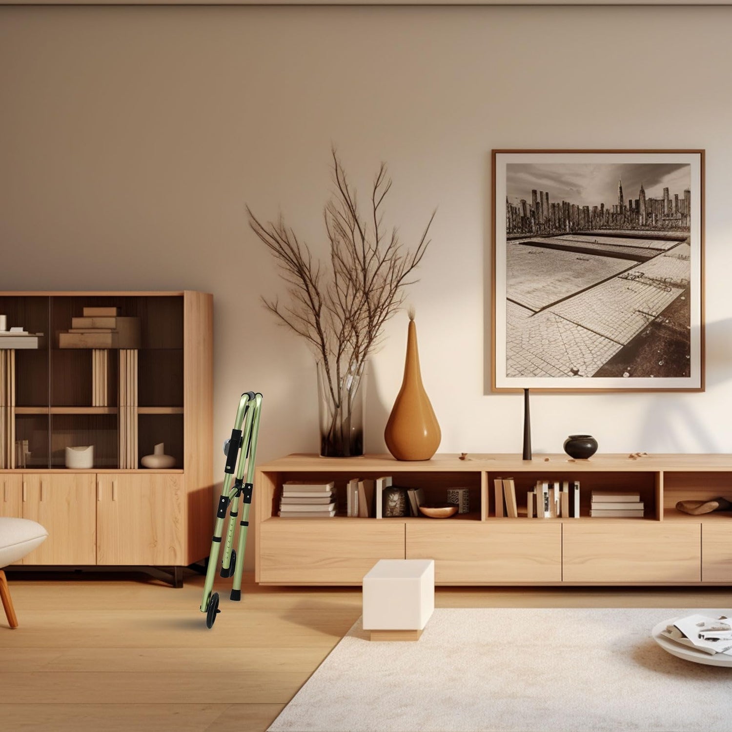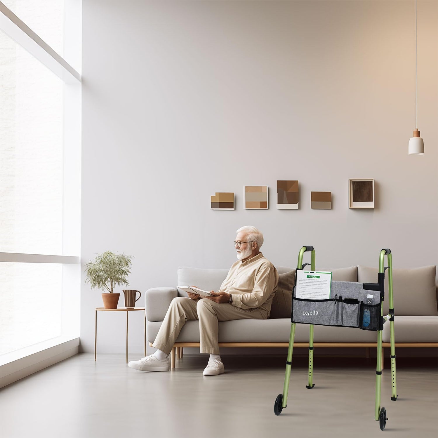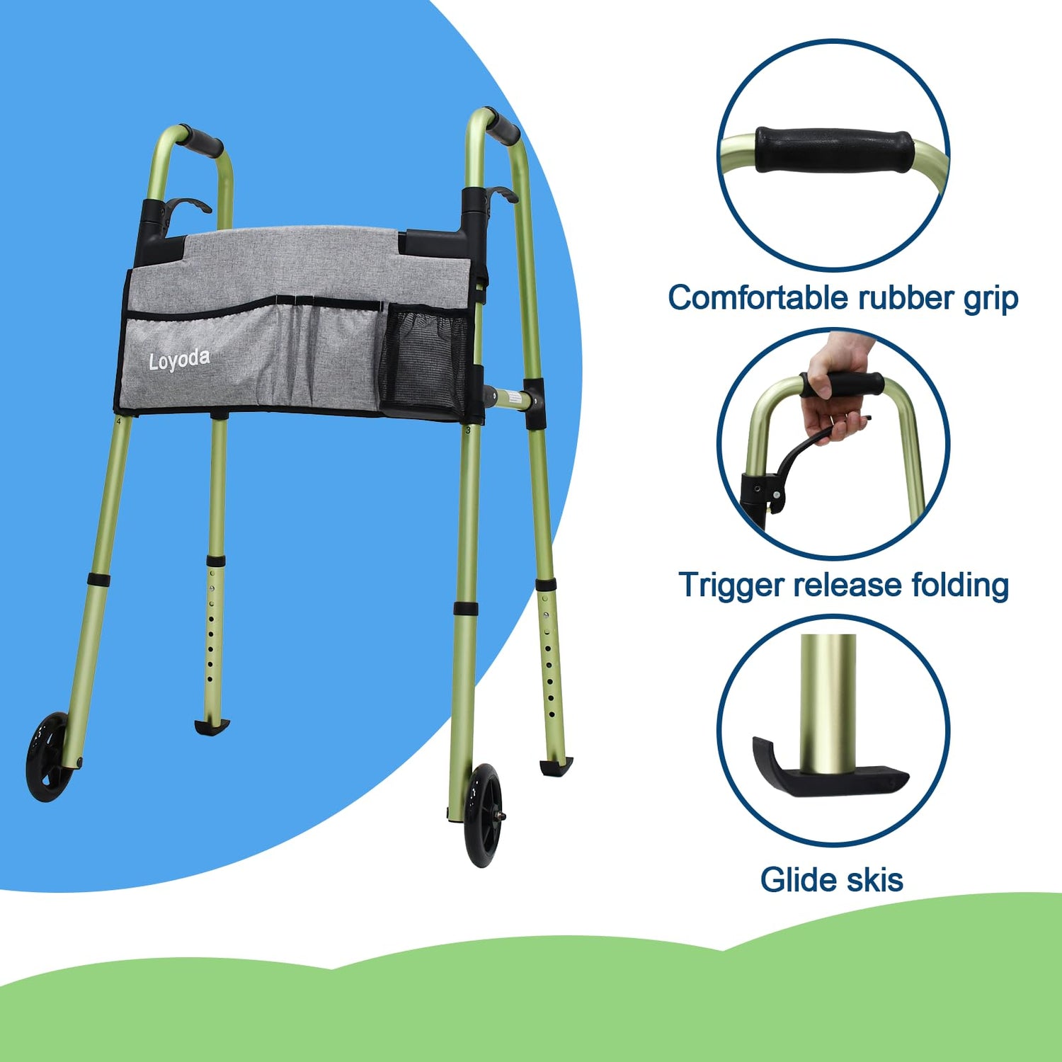 Loyoda Folding Walkers for Seniors,FSA/HSA Eligible Medical Walker with Storage Bag and Glide Skis 5'' Front Wheel Lightweight Walker Height Adjustable Aluminum Standard Walker for Disabled (Green)