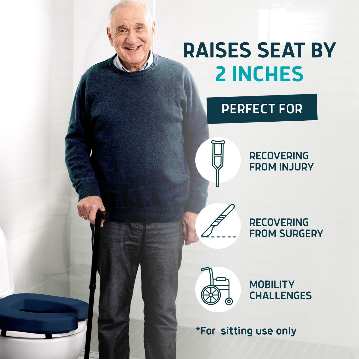 - Raises Seat By 2 Inches: Greater comfort, convenience & independence. Perfect for those recovering from injury or surgery, or those with mobility challenges. Makes sitting and standing a breeze. Foam Cushion must be removed to raise the seat or lower the lid.