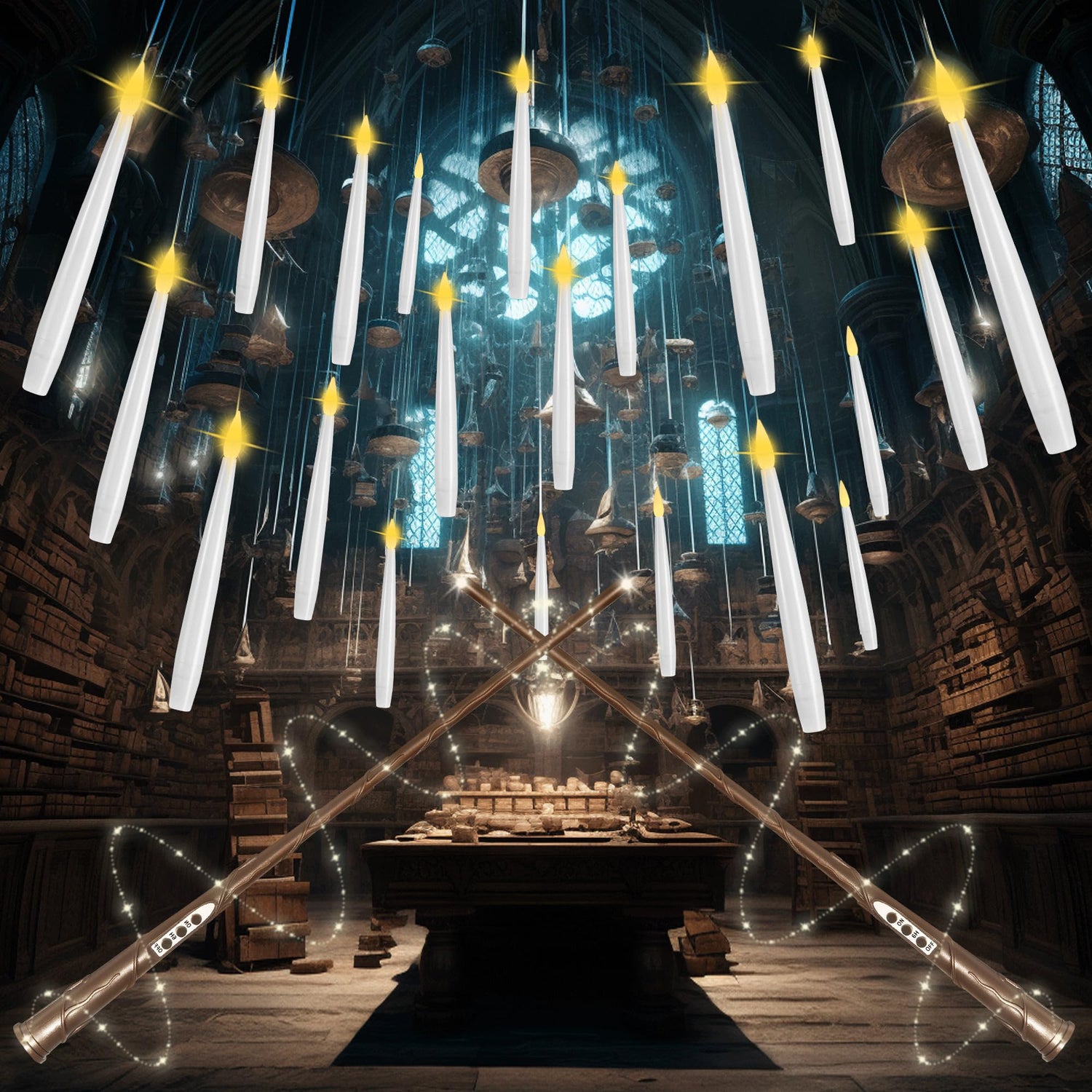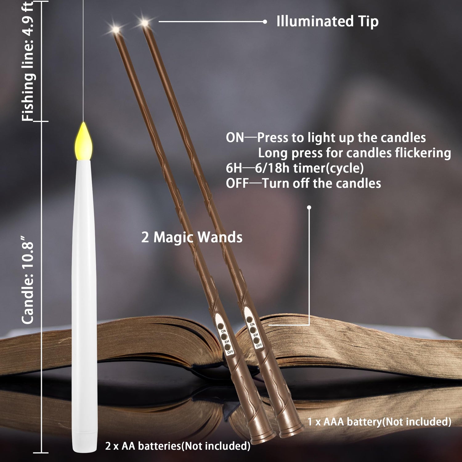 • LONG PRESS "ON" FOR 1-3 SECONDS FOR FLICKERING EFFECT🔮FLOATING CANDLES WITH WAND🔮 Start your magical journey with a cool magic wand remote! It can switch all the flickering flamless candles ON and OFF simultaneously just like magic. Your magic wand remote requires only 1x AAA battery before use(not included). By one click, you can magically light up your floating candles hanging in the air and long press ON, you can change the candles light to flicker effect just like real candles do.
