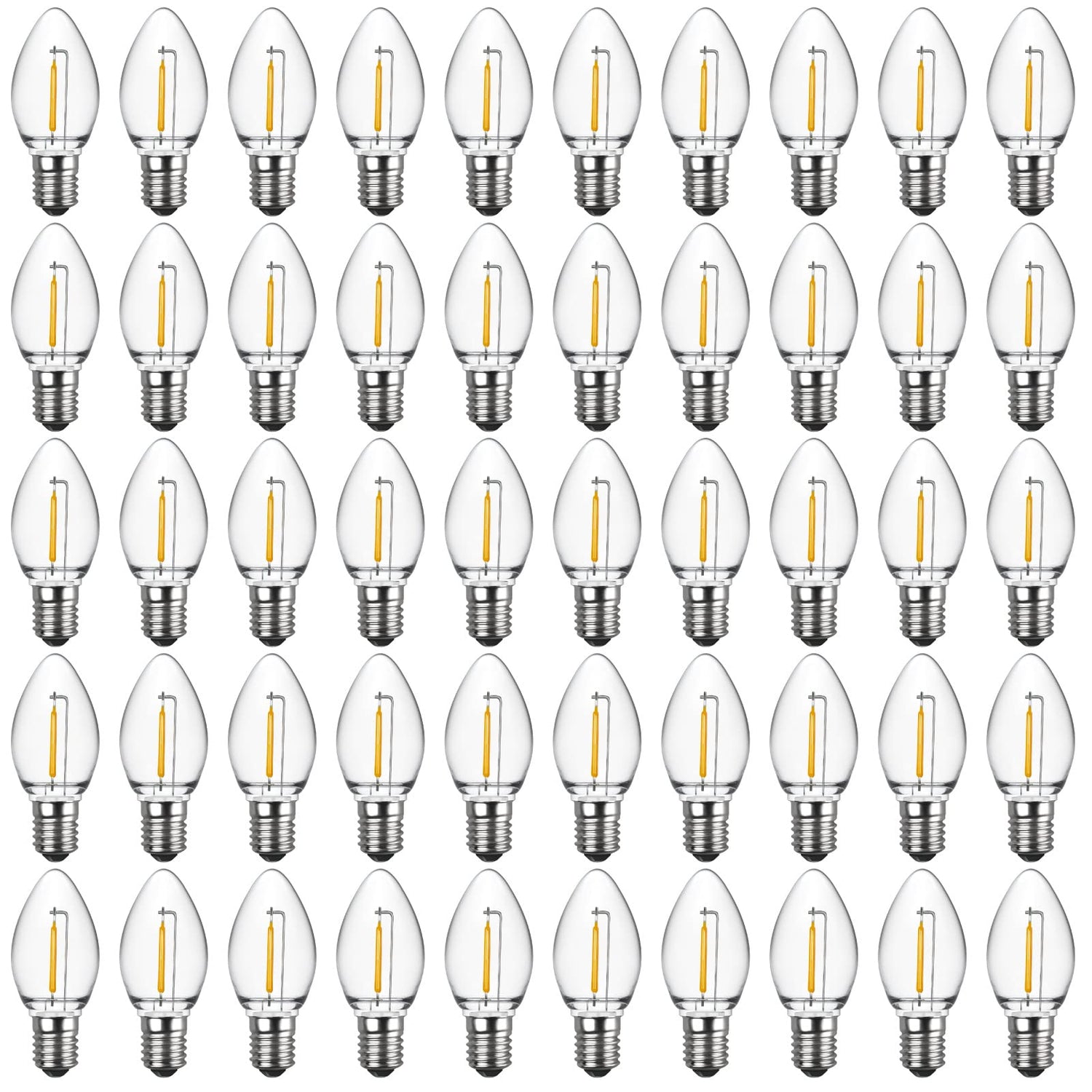 Meconard C7 Led Replacement Christmas Light Bulbs, C7 Shatterproof Led Bulbs for Christmas Outdoor String Lights, E12 Candelabra Base, Commercial Grade Holiday Bulbs, Warm White, 50 Pack