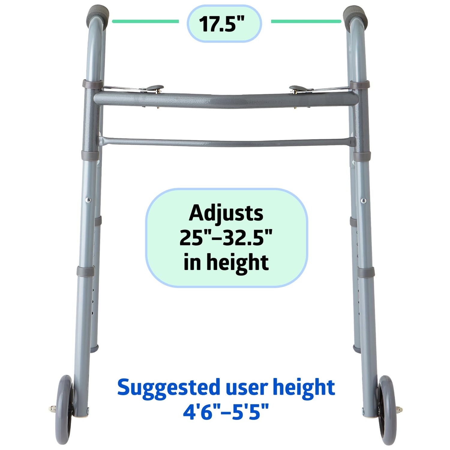 Details: The Medline Lightweight 2-Button Junior Folding Walkers with 5” wheels is perfect for youths, shorter adults and seniors. These lightweight, durable walkers are ideal for anyone with limited mobility, and weigh just 7 lbs. The walkers feature a 2-button folding mechanism that makes them easy to fold and unfold, and the independent side folding design makes them easy to maneuver in tight spaces. These walkers also have a weight capacity of 400 lbs. They are height adjustable from 25 to 32.5” and suitable for anyone between 4’6” and 5’5” in height.