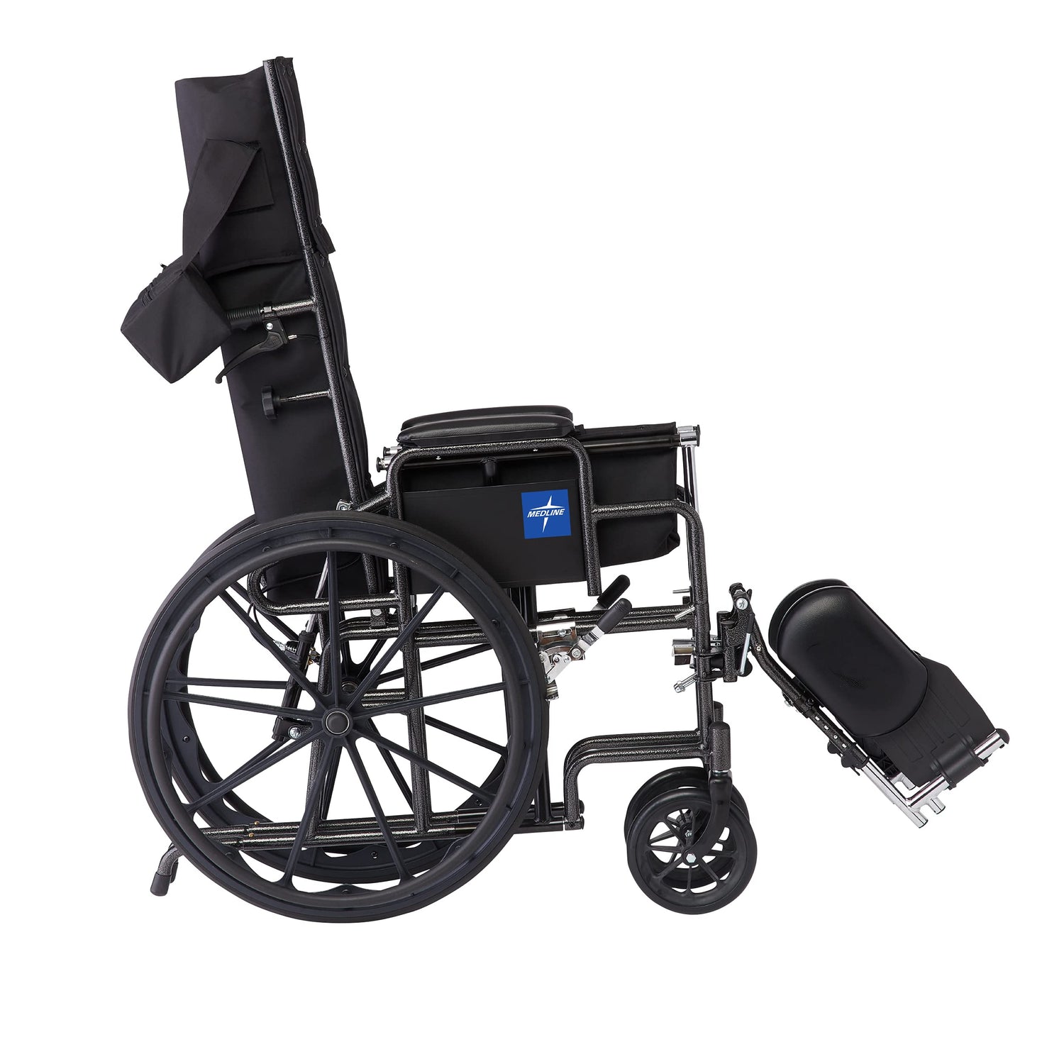 The Medline Reclining Wheelchair with infinite position reclining goes from 90 degrees to 140 degrees with quick adjust handles. Full back and head support is provided by a tall, 22-inch high seatback and 10-inch removable headrest. This wheelchair also features a strong, durable carbon steel frame with chip-resistant silver vein finish. It comes standard with anti-tippers for added safety.