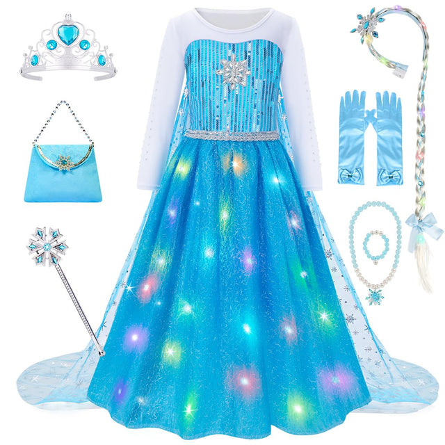 - Designed with Light Up Details on Both the Girls Dress & The Braided Headband - Softly wrapped lights shimmer beneath layers of dress up clothes fabric, giving the dress a gentle glow. Even her long braided headband glimmers with light, ensuring she shines brightest at birthdays, Halloween parades, or family photo moments.