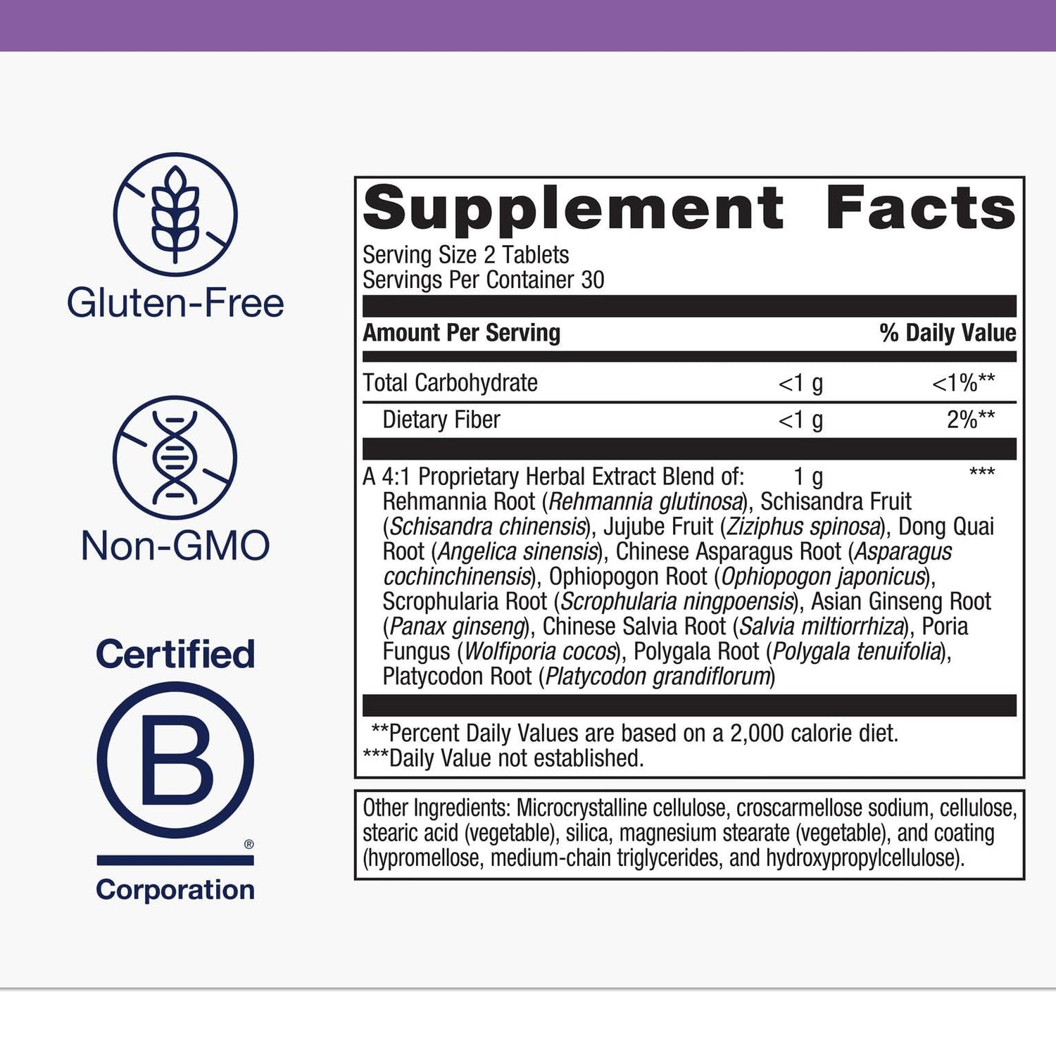 - Herbal Stress Support: A proprietary blend of traditional Chinese herbs, including Rehmannia and Schisandra, to aid in stress management*