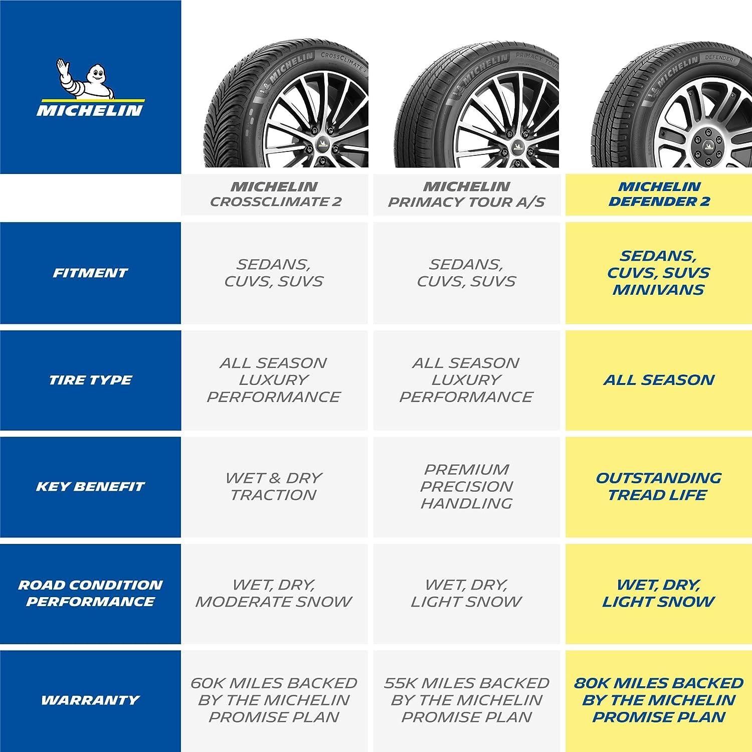 - MICHELIN DEFENDER2 TIRE—The MICHELIN Defender2 tire is our longest-lasting tire[1] – completely redesigned to offer increased tread life, this all-season tire also delivers stopping power so you can drive with confidence even in bad weather conditions