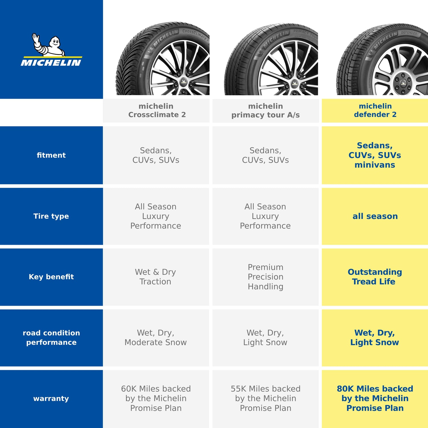 - MICHELIN DEFENDER2 TIRE: The MICHELIN Defender2 tire is our longest-lasting tire – completely redesigned to offer increased tread life, this all-season tire also delivers stopping power so you can drive with confidence even in bad weather conditions