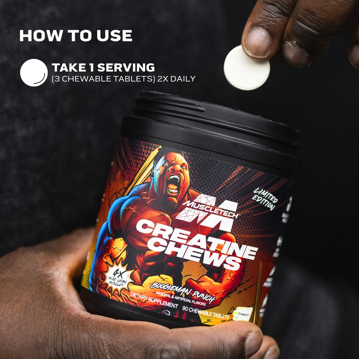 - Enhanced Performance, Winning Taste: MuscleTech Creatine Chews are a convenient way to get in your creatine, supporting muscle growth, strength and performance. Each serving delivers 3g of high-quality Creapure. Boogieman Punch. 90 tablets. 30 servings.