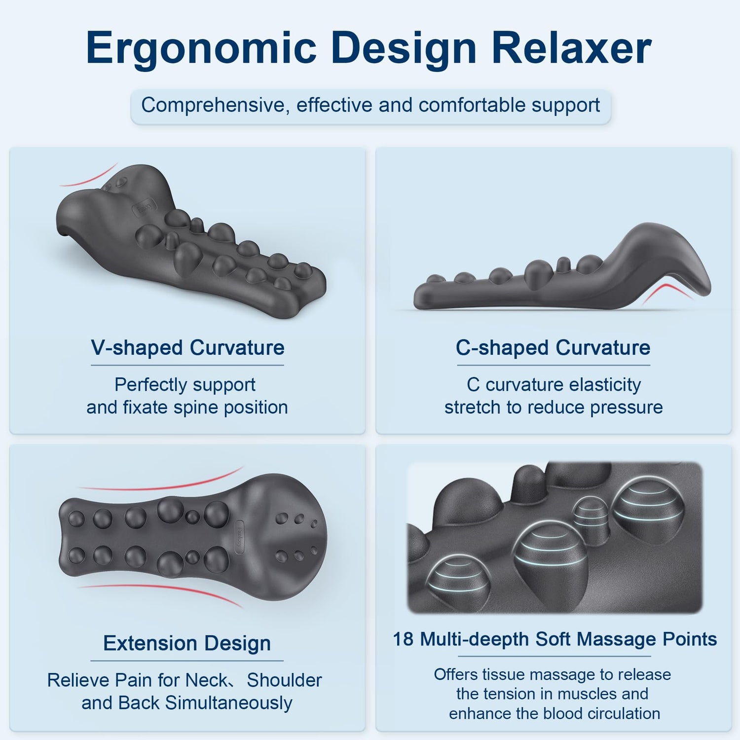 - Neck Support and Upper Back Massager: The extended massage design of the upper back allows our curves to naturally transition to the muscles of upper back, achieving a full range of relaxation from the neck all the way to the upper back. The cushioning design also makes the neck stretch more gentle and effective, without any damage to the body. Trigger Point therapy simulates finger massage , release the fatigue in your muscles and enhance blood circulation.
