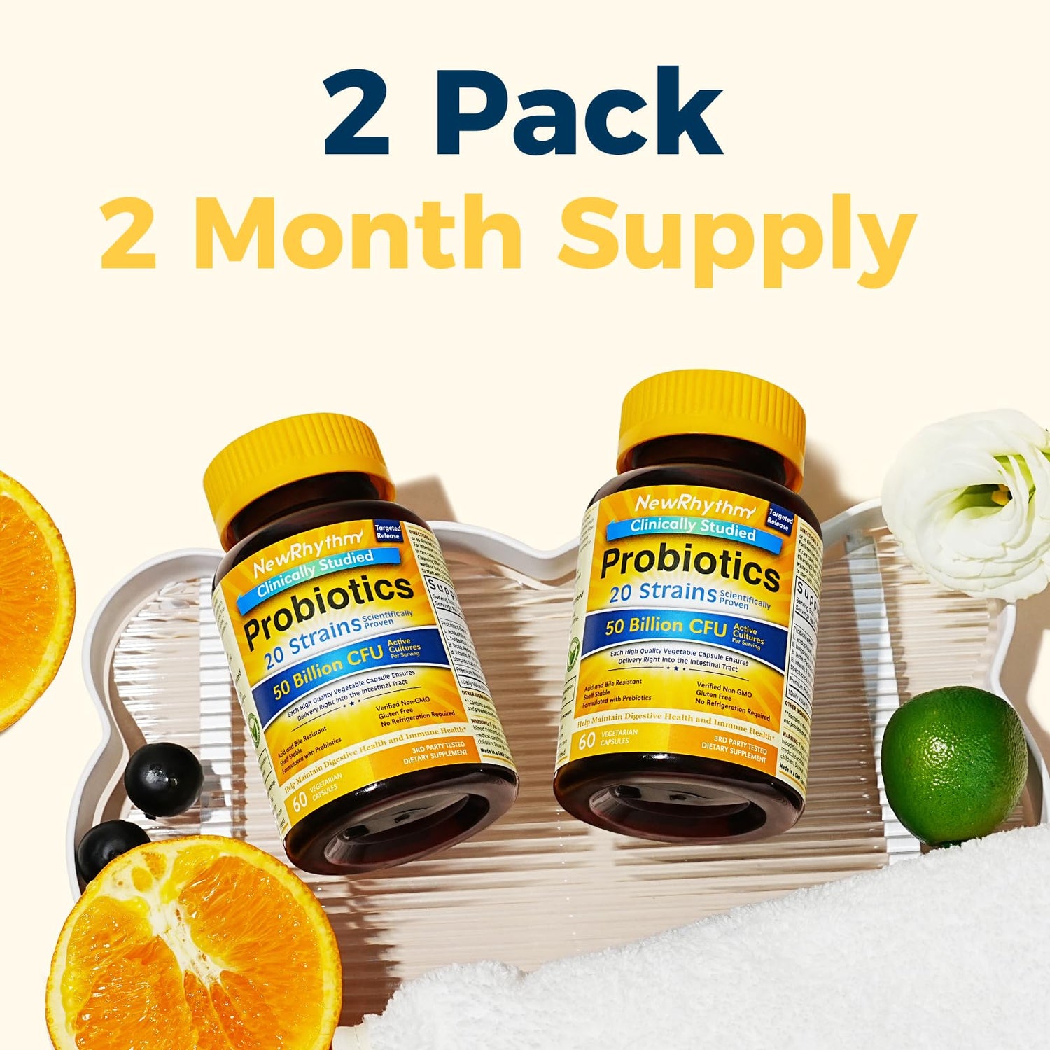 NewRhythm Probiotics 50 Billion CFU 20 Strains, 120 Veggie Capsules, Targeted Release Technology, Stomach Acid Resistant, No Need for Refrigeration, Non-GMO, Gluten Free