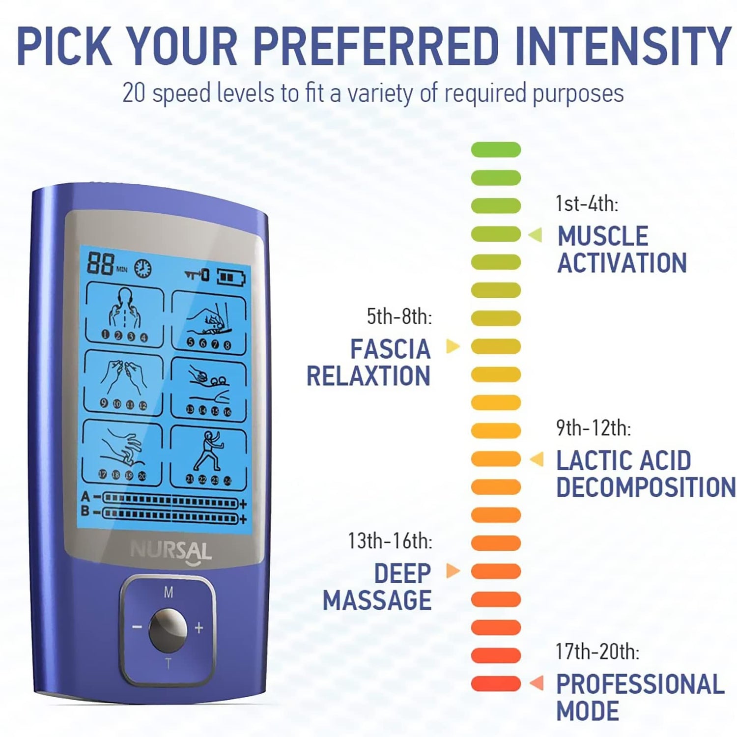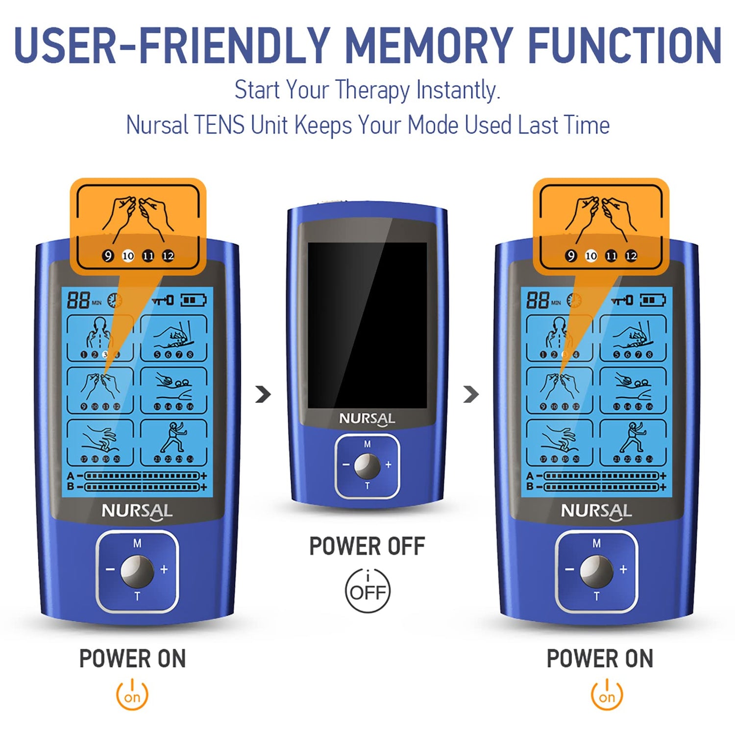 - A/B DUAL CHANNELS TENS: You can set separate modes and intensities for channel A and channel B, the TENS machine last memory function will remember your preference of mode setting. Relax your body and relieve general body pain anytime with NURSAL electrotherapy muscle stimulator pulse massager and accessories.