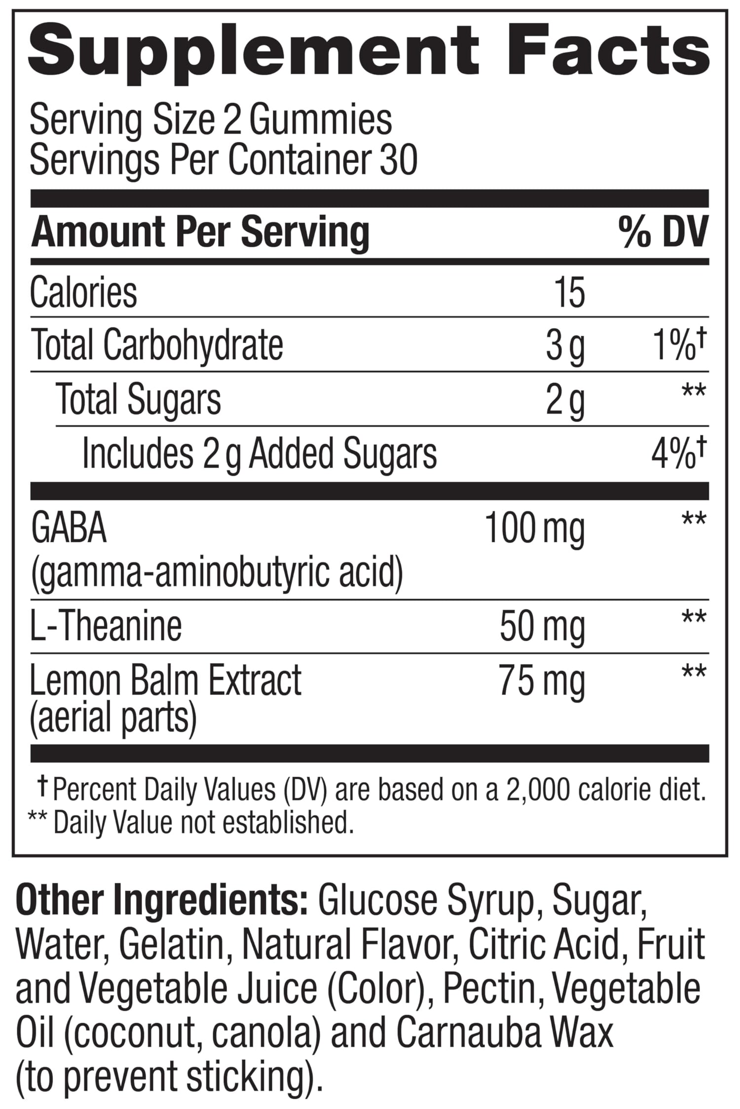 - THE GOODS INSIDE: GABA and L-Theanine partner up to support a relaxed state of mind and help you keep your cool in moments of occasional stress.* Lemon Balm Extract has been used for centuries
