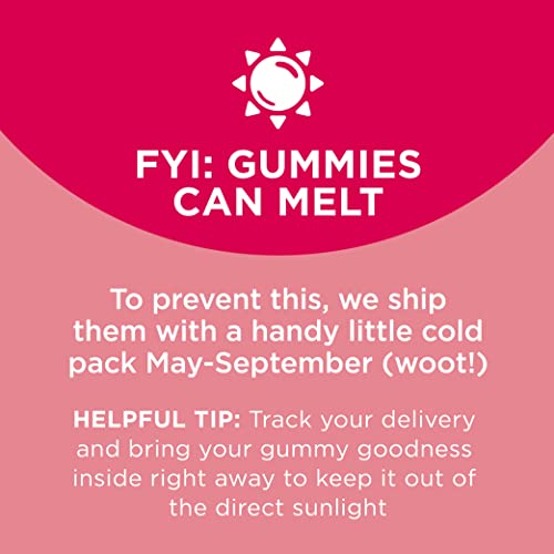 - SHIPS WITH A COLD PACK: Gummies can melt in the heat. To prevent this, we ship them with a handy little cold pack May-September (woot!). Track your delivery so it's not left outside for too long and keep it out of direct sunlight