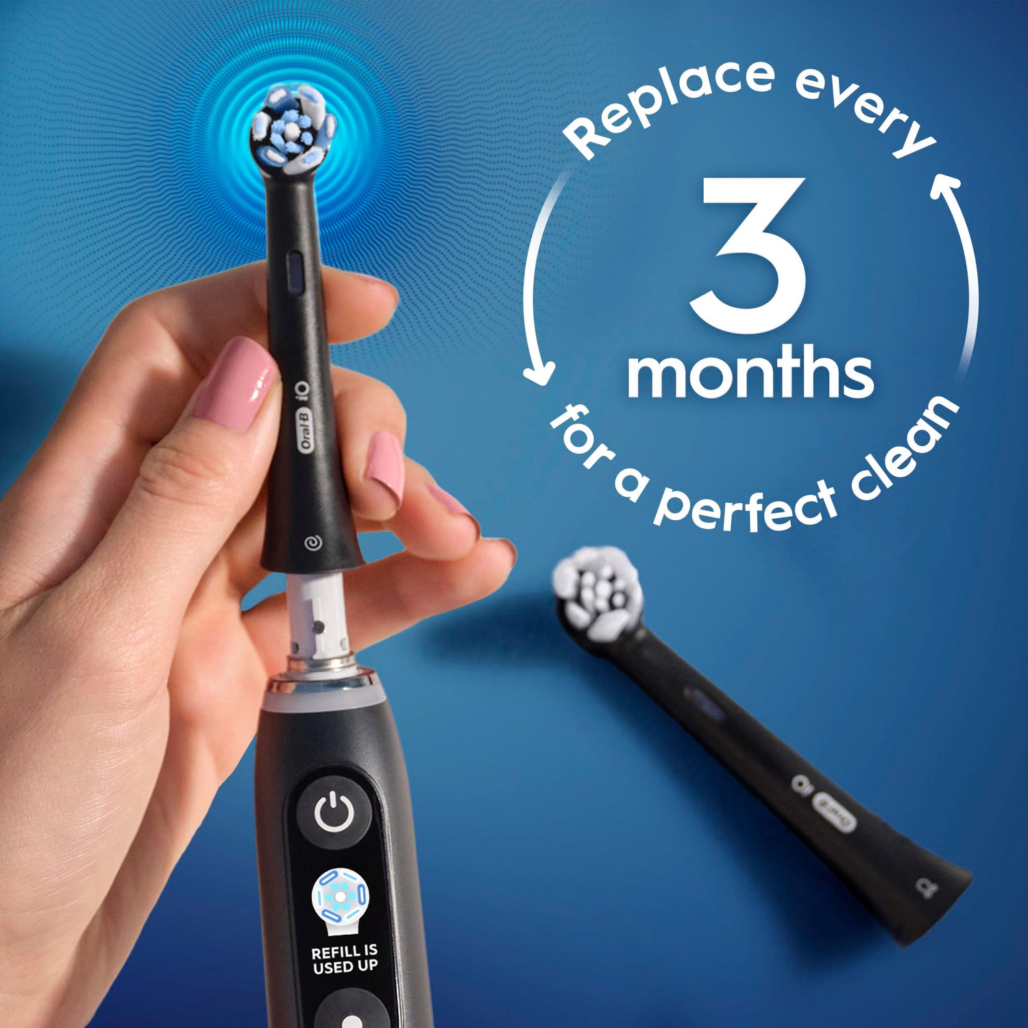 Details: Say goodbye to guesswork! With iO refill technology, your brush head knows when it's time for a change. Watch the magic unfold as the color transforms from vibrant blue to pristine white, signaling when to it's time to change and ensuring a fresh and effective clean every time. The iO collection is Oral-B’s best technology. These replacement brush heads contain High Density Dentist-inspired extra soft bristles for a gentle clean. Optimized bristle patterns adapt to the curves of the teeth and gums but are extra soft for maximum comfort. Precision fit with a gentle clean. Compatible with Oral-B iO Electric Toothbrush Handles. Dentists recommend changing your brush head every 3 months for best results. You will receive 5 Oral-B iO Gentle Care Replacement Brush Heads. 4CT Ultimate Clean + 1CT Gum & Sensitive Black. Best of all, it is brought to you by Oral-B—the #1 brand used by dentists worldwide.* *Based on surveys of a representative worldwide sample of dentists carried out for P&G regularly. Do not use on children under age 3. Replace brush every 3 months or sooner if brush head becomes wor