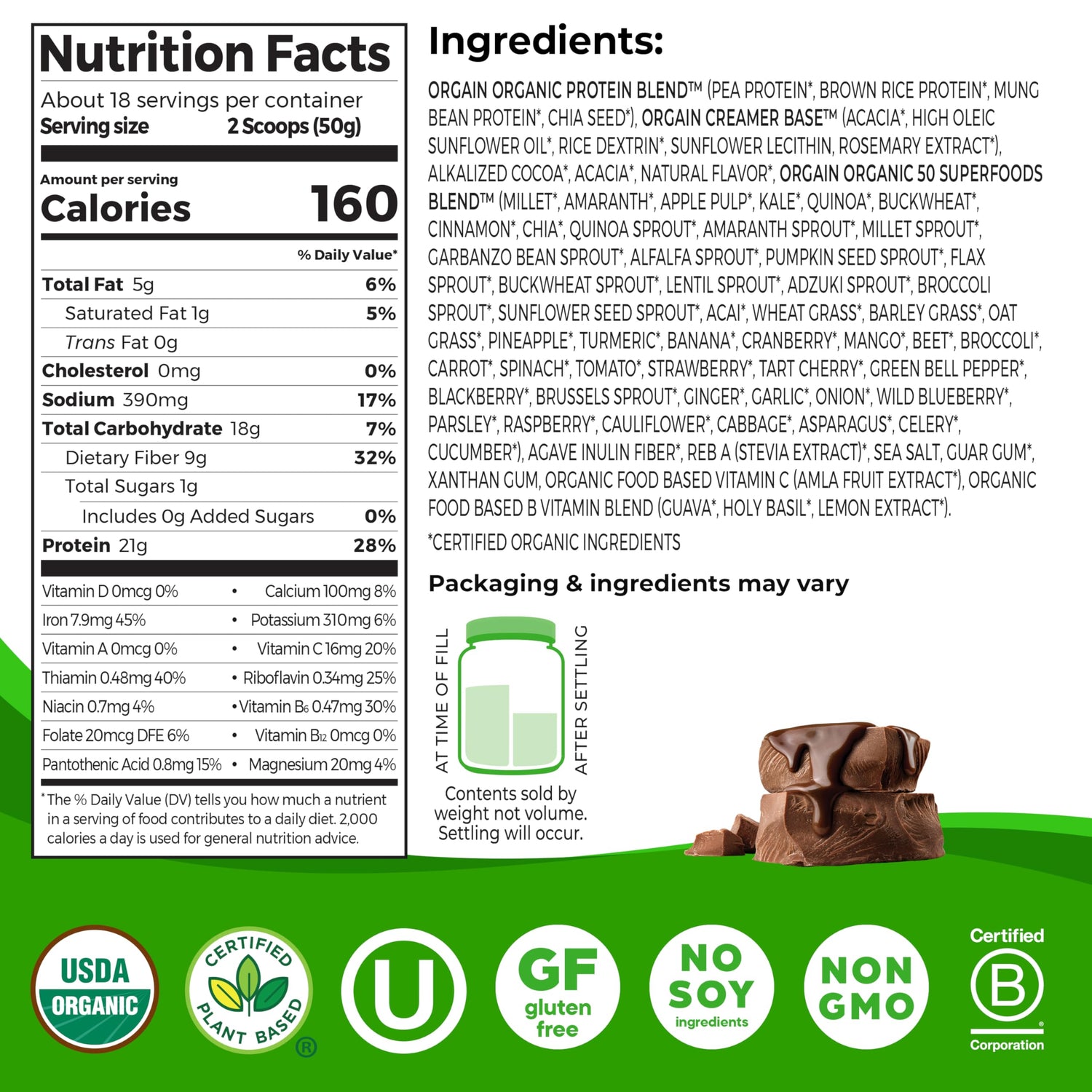Orgain Organic Vegan Protein Powder + 50 Superfoods, Creamy Chocolate Fudge - 21g Plant Based Protein, Gluten Free, Dairy Free, Lactose Free, Soy Free, No Sugar Added, Kosher, B Vitamins - 2.02lb