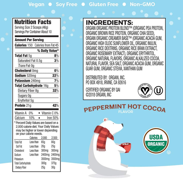 - Includes 1 (1.02 Pound) Orgain Organic Plant Based Peppermint Hot Chocolate Protein Powder. Get yourself in the holiday spirit with this seasonal flavor protein powder. This powder makes a great Christmas or holiday gift