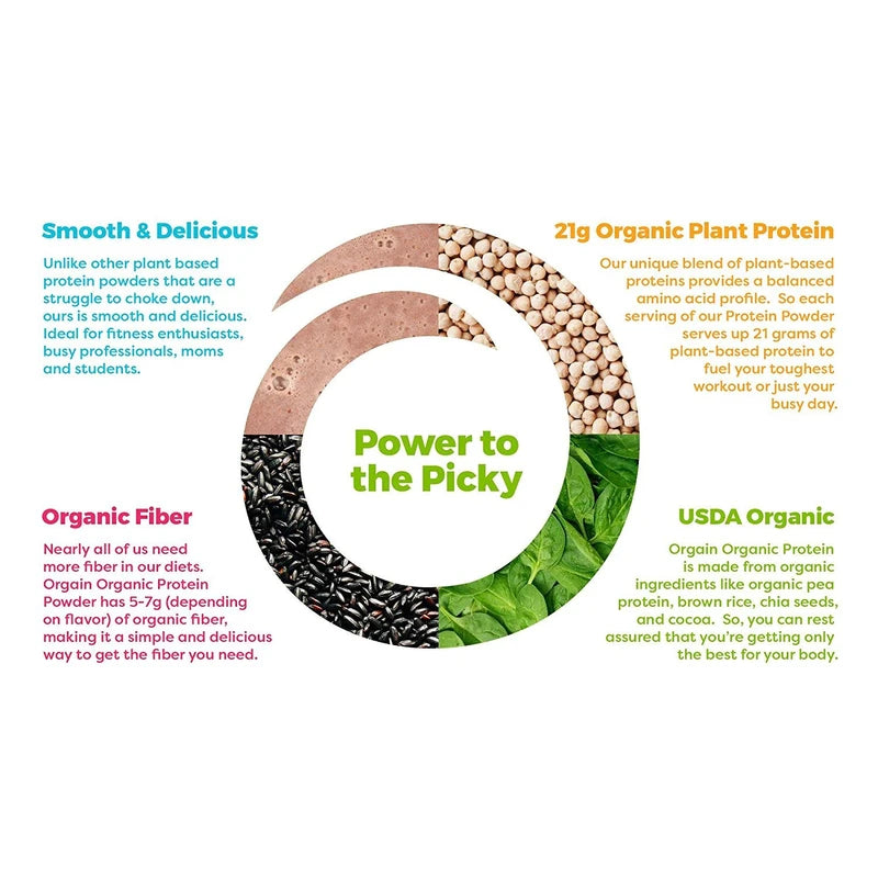- 21 grams of organic plant based protein (pea, brown rice, chia seeds), 2 grams of organic dietary fiber, 0 grams of sugar, 160 calories per serving.