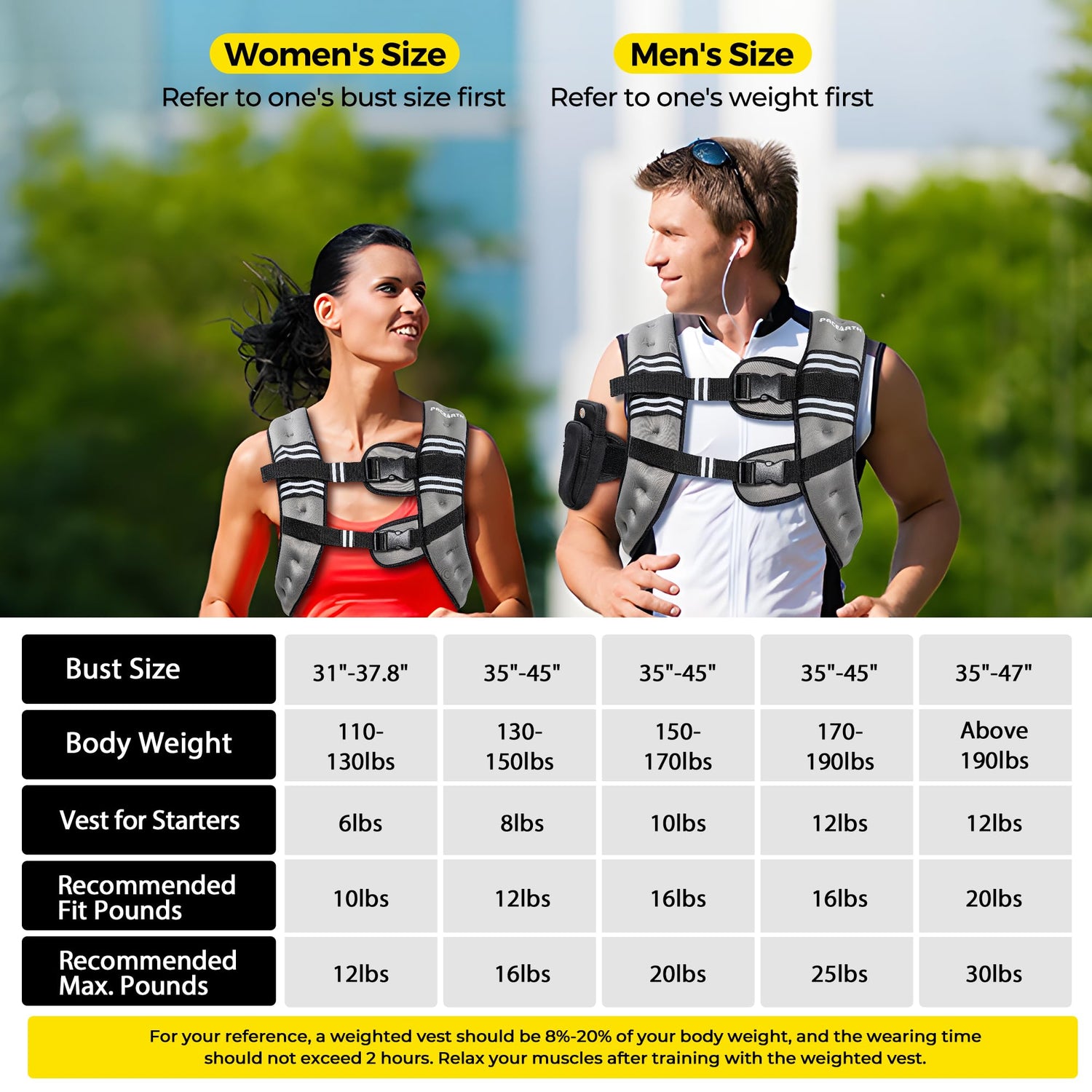 - For beginners , we recommend following the beginner weight guidelines on our size chart and gradually increasing the intensity of your workouts. When choosing your size, please use your chest measurement and body weight for the best fit.new weighted vests may have a mild neoprene scent when first unpacked. This is completely normal and will dissipate quickly if aired out overnight in a well-ventilated area.