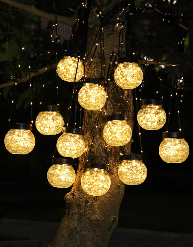 PARTPHONER Solar Lights Outdoor Waterproof 12-Pack, Solar Powered Hanging Lantern Cracked Glass Hanging Globes for Yard Decor Christmas Decoration, Shepherd Hook, Garden Tree Table Ornaments, Warm