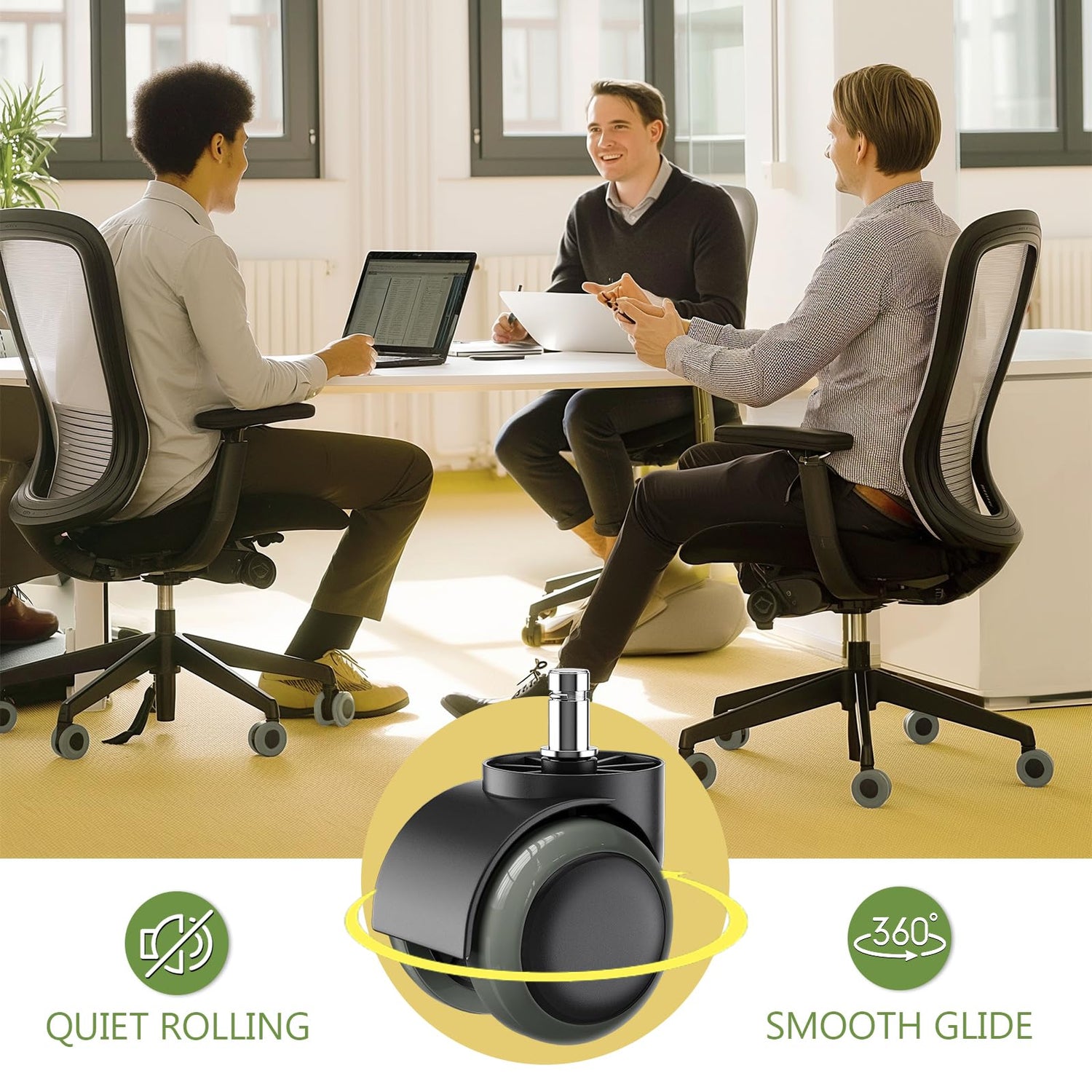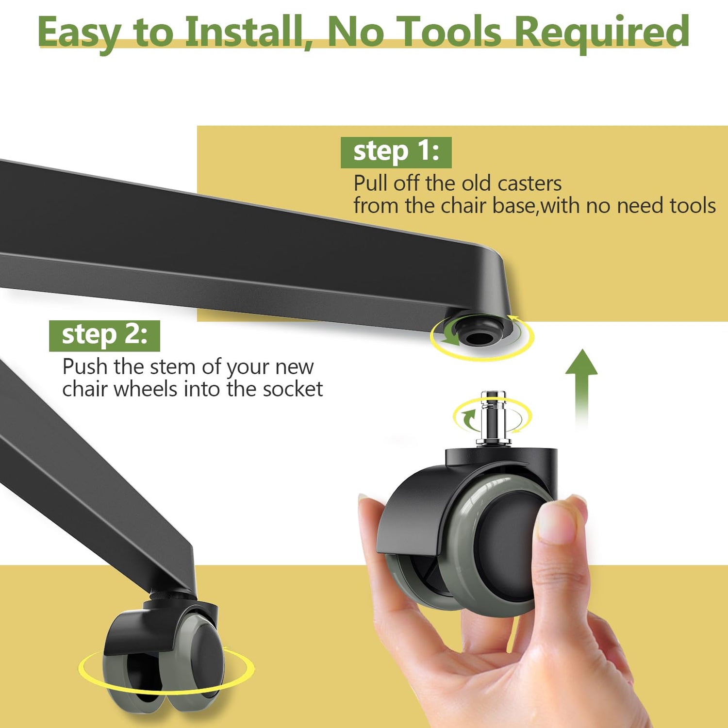 - No Tool Installation - Easy assembly in 5 minutes. Simply pull out your current casters down and push in chair replacement wheels into the socket, then start enjoy your comfortable working time!