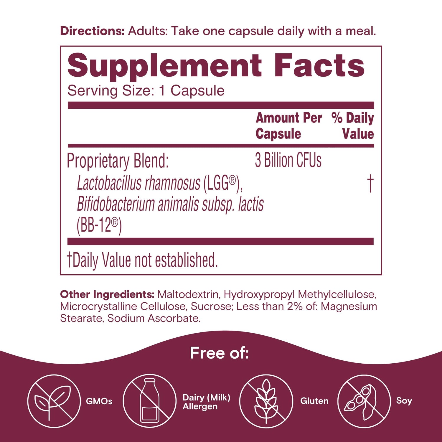 - Contains Specially Selected Probiotics: Lactobacillus rhamnosus (LGG) and Bifidobacterium (BB-12). Non-GMO; Gluten Free; Dairy Free and Soy Free. No refrigeration required
