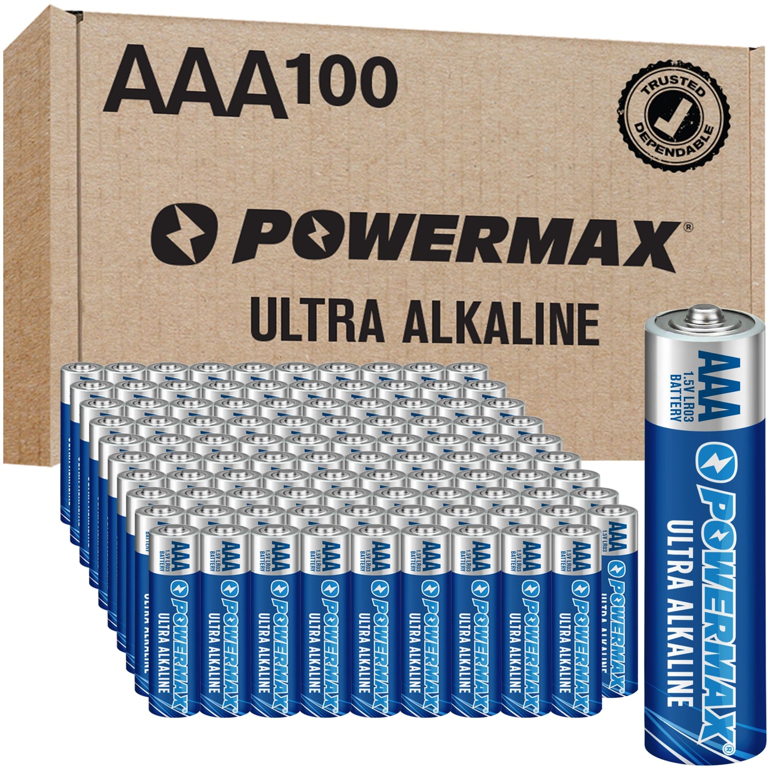 Powermax 100-Count Triple AAA Batteries, Ultra Long Lasting Alkaline Battery for Home and Office, 10-Year Shelf Life, Reclosable Packaging