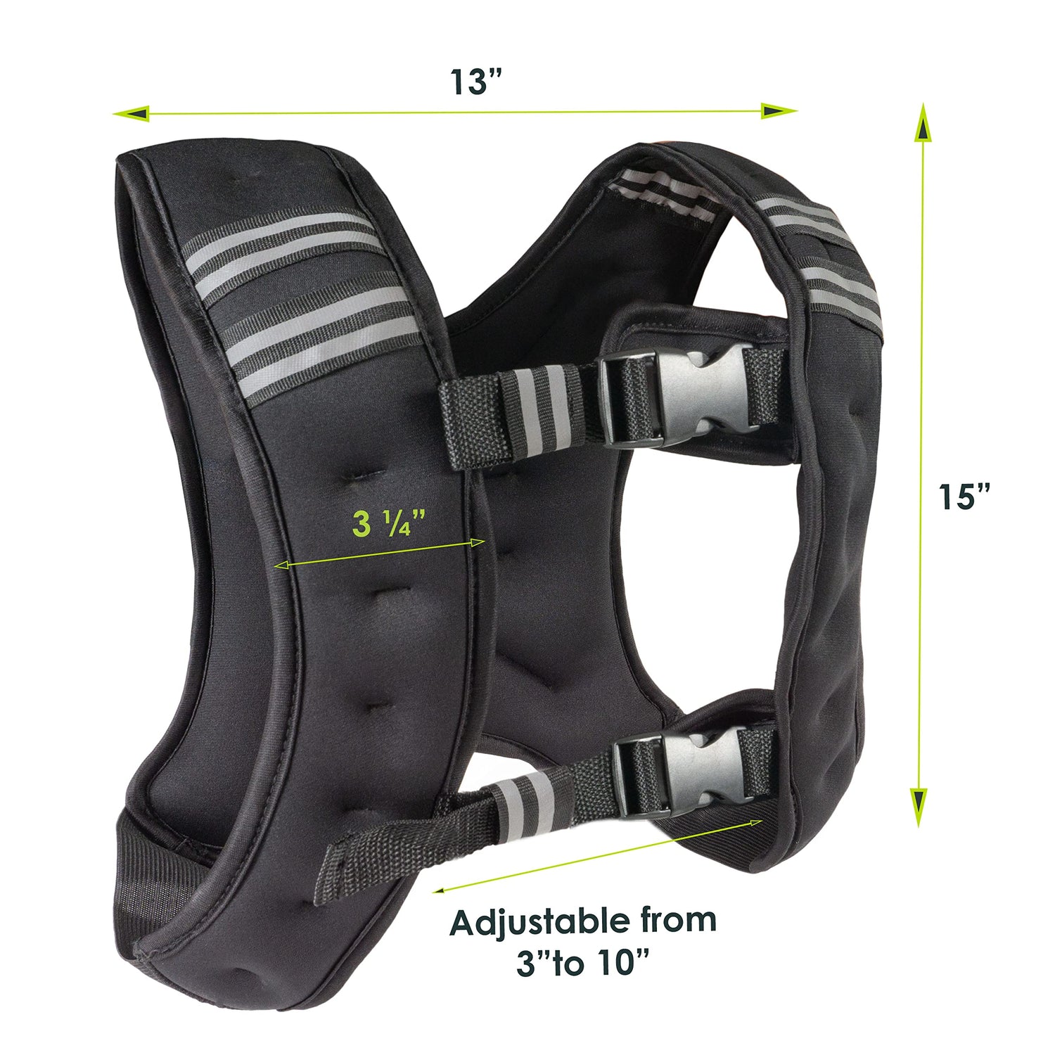 Details: The ProsourceFit Weighted Vest is a versatile way to enhance workouts at home, the gym or outdoors. Full body resistance training is now made convenient with a hands-free way to build muscle strength, stamina and bone density without the hassle of extra equipment. Use by itself during a cardio session, cross-training, calisthenics or simply incorporate with other equipment for extra muscle burn during strength training. Made of durable and soft neoprene, the weighted fitness vest is breathable and comfortable to wear for long periods of time. Adjustable top and bottom buckles allow for a snug fit no matter your height or body type. Weights in the vest are placed in secure pockets and are perfectly balanced so you can experience evenly distributed resistance on your body. The mesh back pocket provides extra storage space for workout accessories or personal items like keys or wallet for a truly hands-free workout. The sleek design of the weighted vest doesn't come with bulk and rests perfectly on your shoulders with a curved back design for the ultimate fit. For evening exercisers, reflective strips are located in the front and back of the weighted vest for safety. Suitable for men and women of all fitness levels or athletes, you can find your ideal resistance with the 5 weight options available - 6lbs, 8lbs, 10lbs, 12lbs or 20lbs.