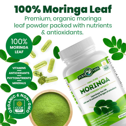 Pack of 3 PURA VIDA MORINGA Capsules Single Origin Organic Moringa Powder. Moringa Leaf. Energy, Metabolism, & Immune Support. 120ct. 500mg Caps. (Pack of 3)