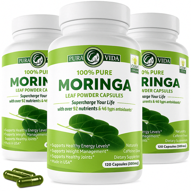 Pack of 3 PURA VIDA MORINGA Capsules Single Origin Organic Moringa Powder. Moringa Leaf. Energy, Metabolism, & Immune Support. 120ct. 500mg Caps. (Pack of 3) is backordered and will ship as soon as it is back in stock.