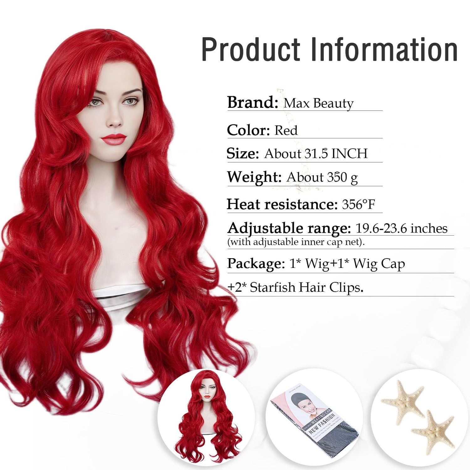 Red Curly Wig , Max Beauty Red Mermaid Cosplay Wigs for Woman with Starfish Hair Clips, Adult Long Hair Daily Wig Heat Resistant Synthetic Fiber for Halloween for Cosplay for Christmas (Red 1)