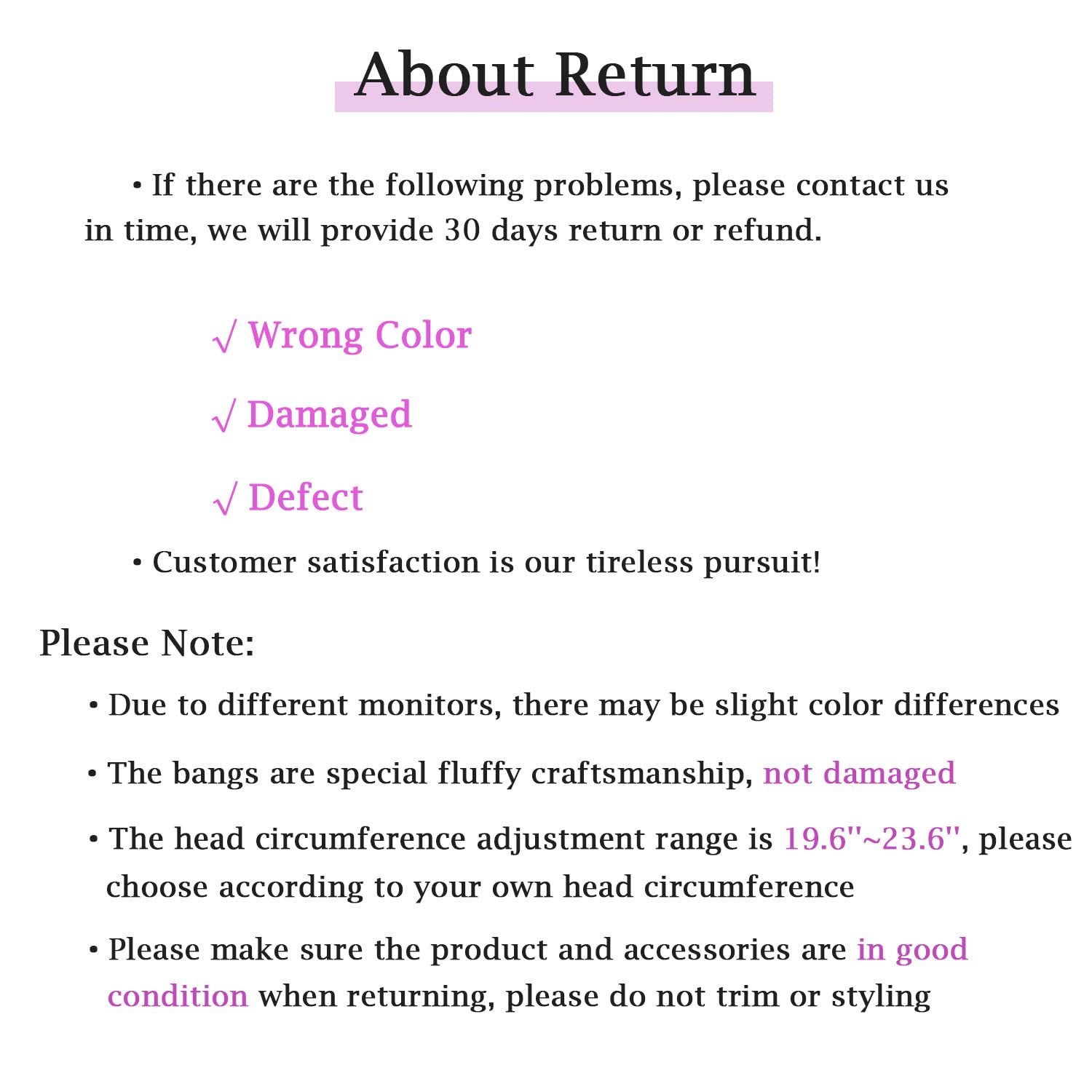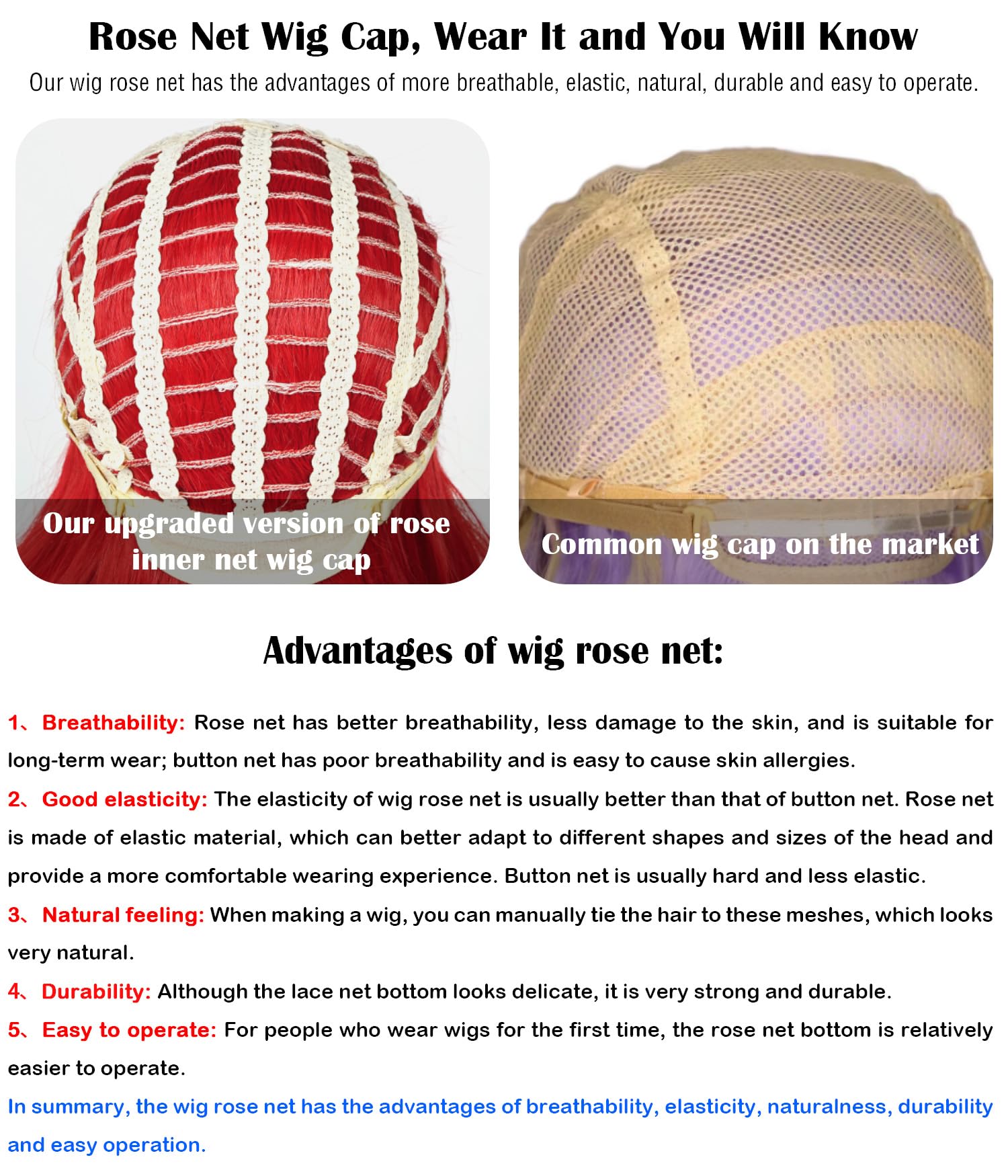 - [Adjustable Size - 19.6'' - 23.6''] -The inner rose mesh cap comes with 2 adjustable straps, you can adjust its size to fit your head and hold the wig firmly in place. In addition, the inner mesh cap is made of high-grade rose lace, which is breathable and elastic, easy to wear and comfortable.