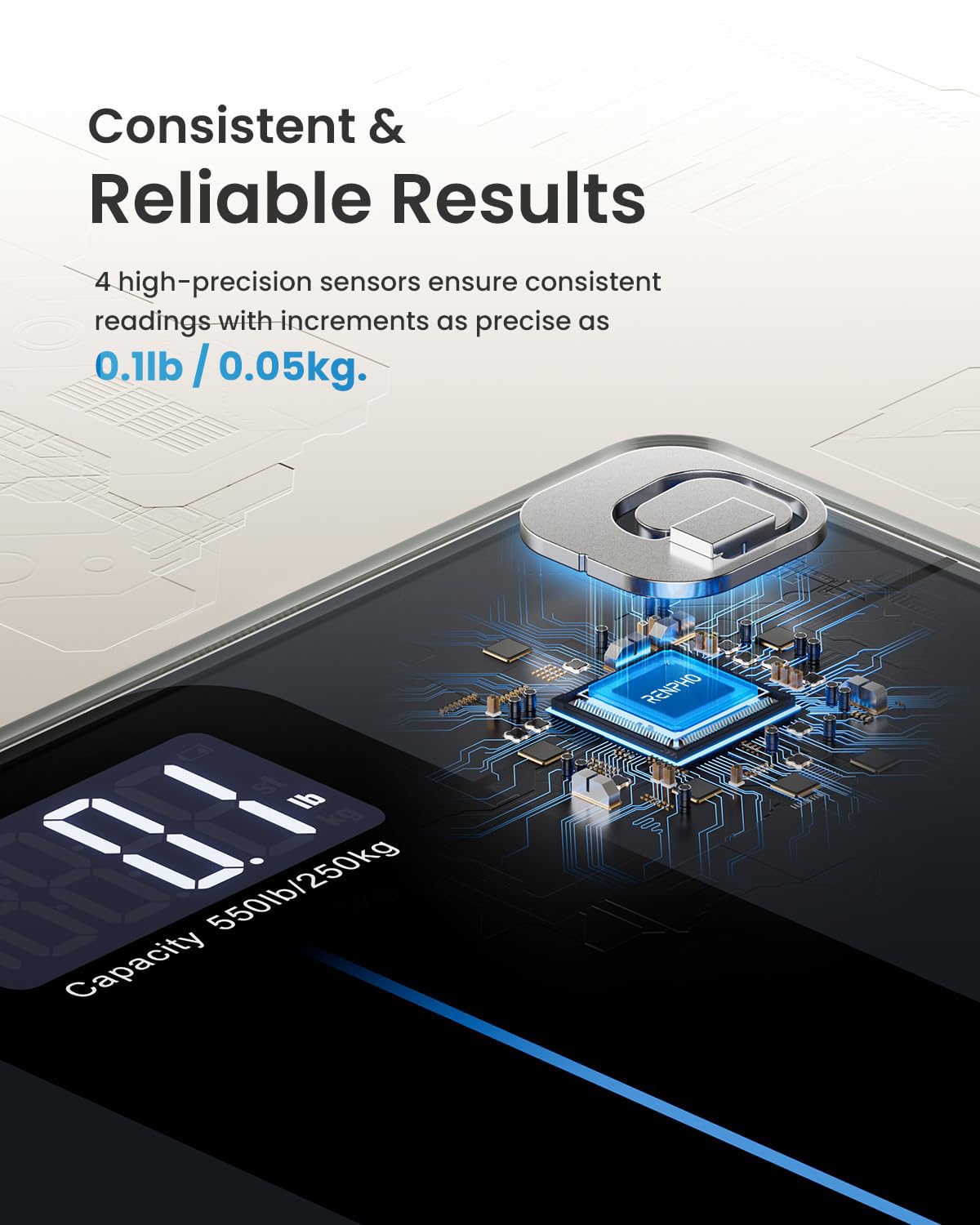 - 550lb Capacity, Extra-wide Platform: This body scale with a larger 550lb/250kg weight limit capacity is designed for different body builds, offering accurate and reliable weight measurements in 0.1lb/0.05kg increments. The expanded platform (13x11.8in/330x300mm) caters to various foot sizes, delivering enhanced stability and comfort to empower your wellness journey.