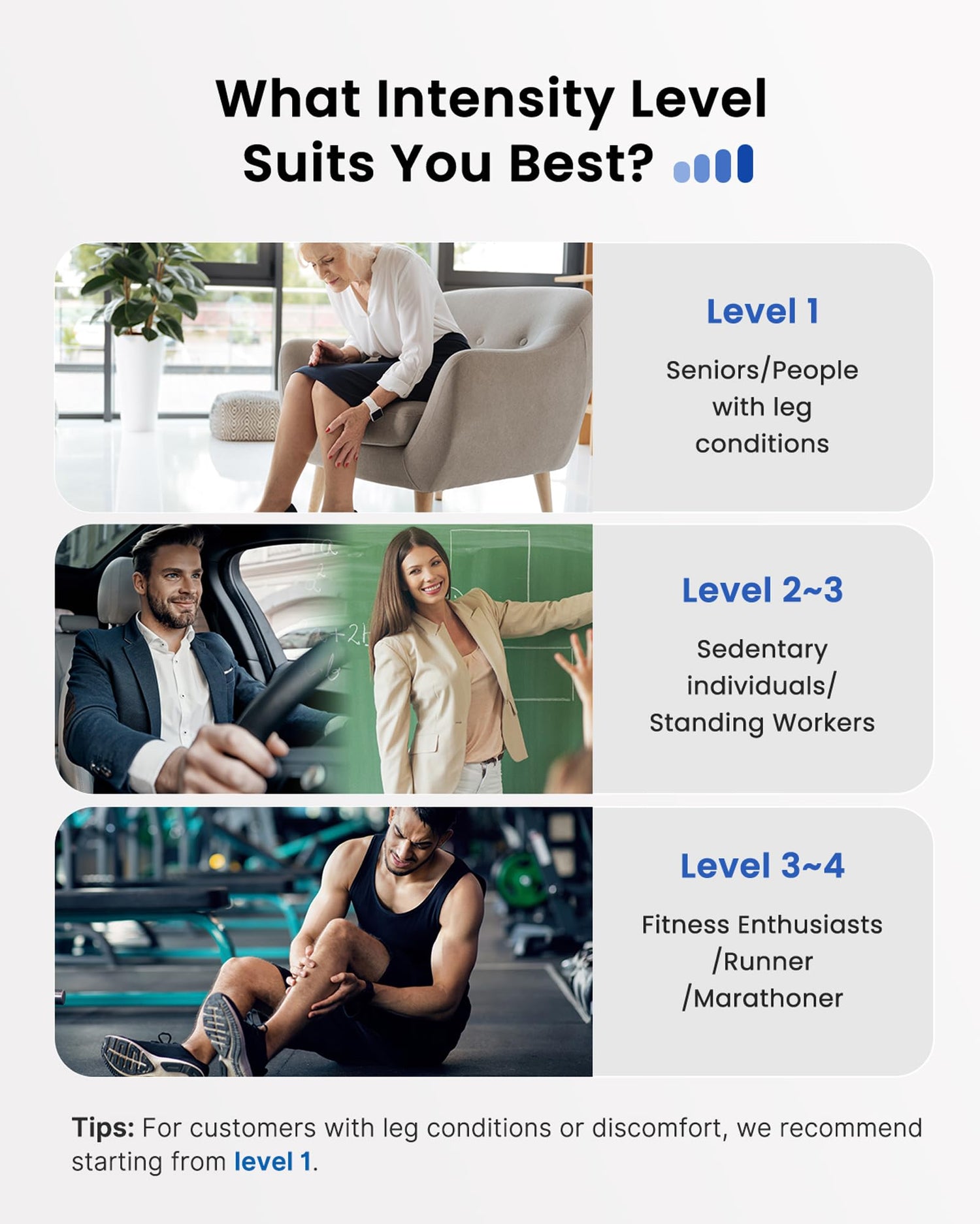 - 4 Massage Intensity: This massager features 4 massage intensities and two main modes - Combine and Separate. We recommend that elderly individuals and those with leg injuries start at level 1 to avoid exacerbating pain due to excessive pressure