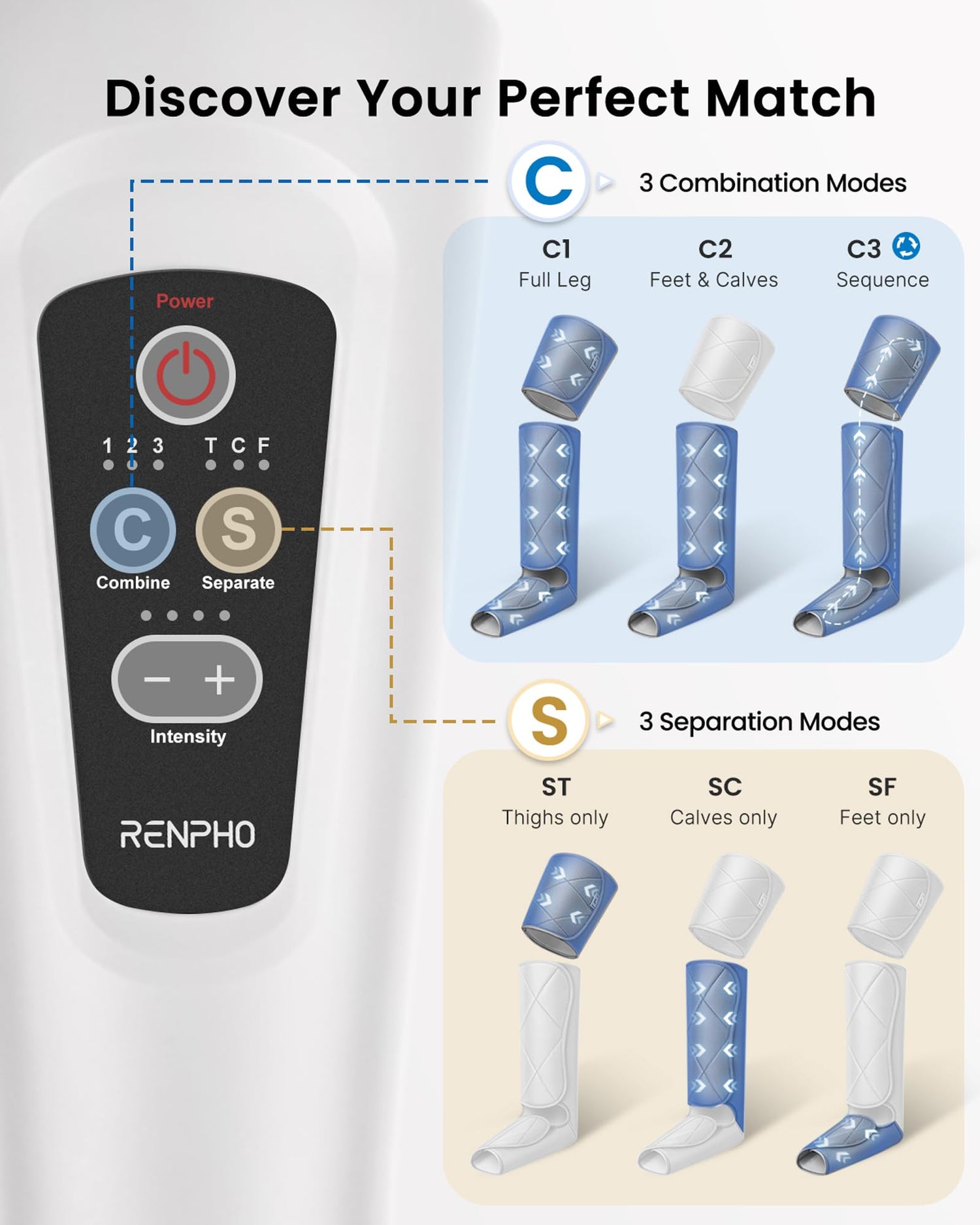 - 6 Modes: In Separate mode, you can individually massage the feet, calf and thigh, targeting specific areas according to your needs. In Combine mode, massage the entire leg together or cycle from feet to thigh. Note: Please leave one finger gap when using