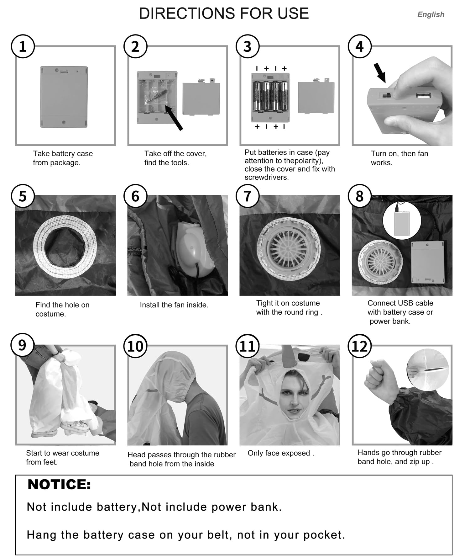 - Includes inflatable costume suit, fan blower, battery box, uses 4x AA batteries (not included)