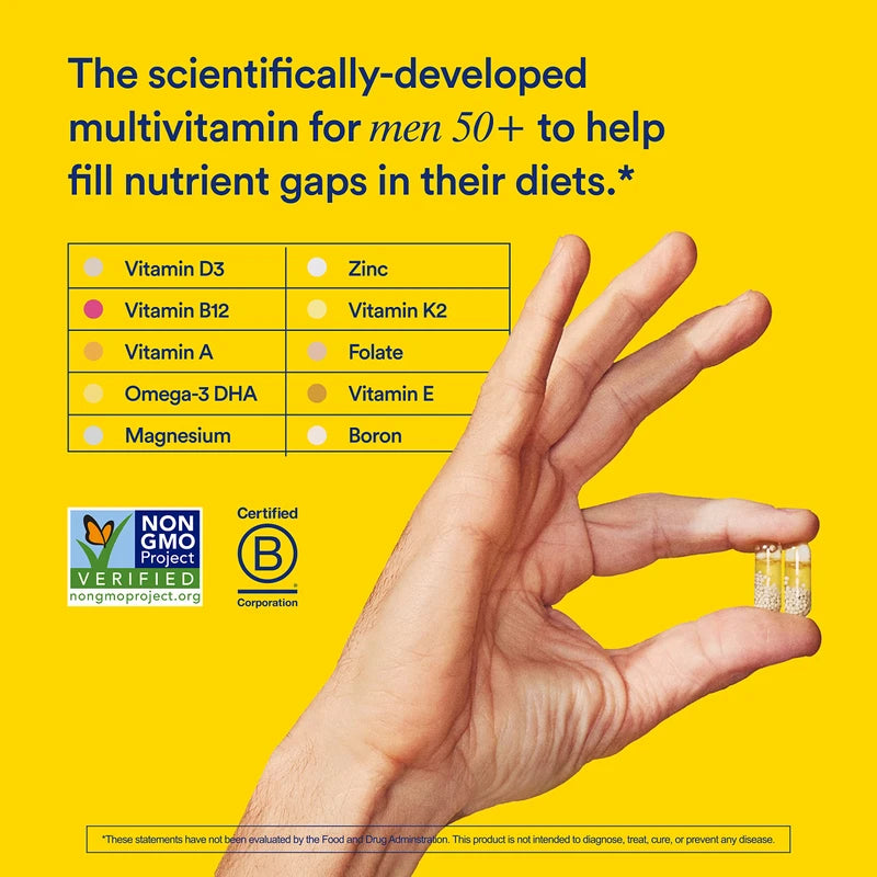 - Essential for Men Multivitamin 50+ is the scientifically-developed multivitamin with 10 key nutrients for men 50+. Our formula is vegan, sugar-free, gluten-free, dairy-free, nut-free, soy-free, and formulated without stevia, sugar alcohols, and artificial colors, flavors, or sweeteners. Each serving provides 330mg of Omega-3 DHA.*