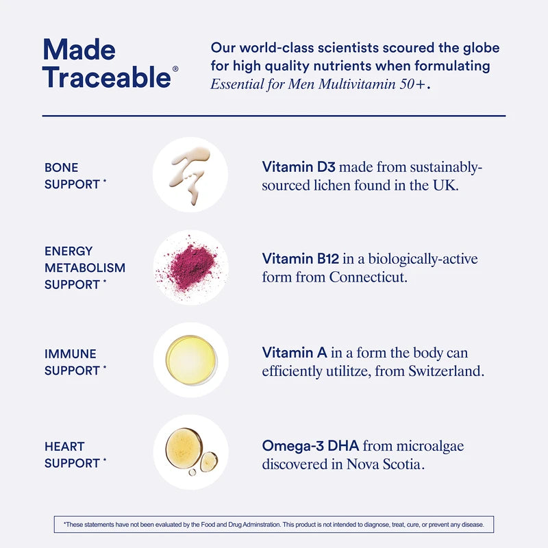- Made Traceable: Our world-class scientists scoured the globe for high quality ingredients when formulating Essential for Men Multivitamin 50+. Our formula includes Vitamin D3 made from sustainably-sourced lichen found in the UK - for bone support, Vitamin B12 in a biologically-active form from Connecticut - for brain support, Vitamin A in a form the body can efficiently utilize, from Switzerland - for immune support, and Omega-3 DHA from microalgae discovered in Nova Scotia - for heart support.*
