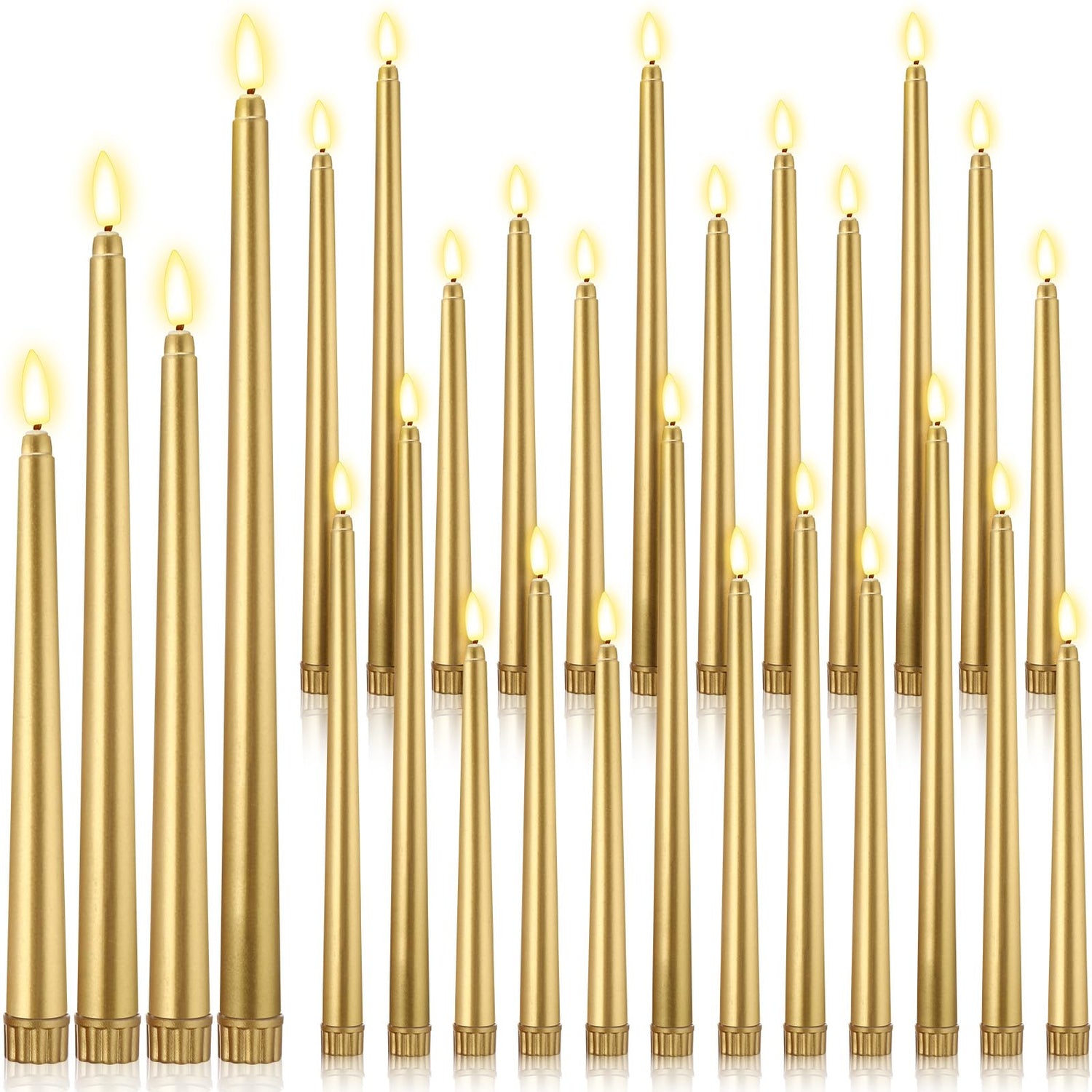 Rossesay 24 Pcs Flameless LED Taper Candles Battery Operated Candles 8.58'', 9.69'', 10.98'', 12.91'', 12.8'' Flameless Candlesticks Flickering for Halloween Christmas Church Wedding(Golden)