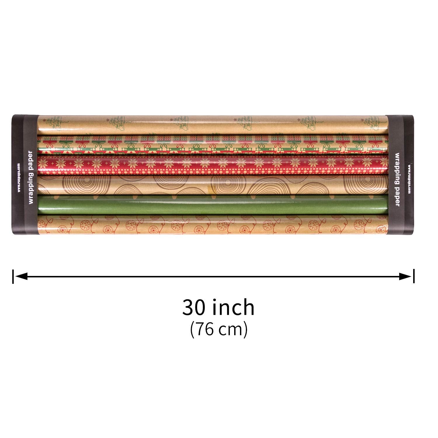 RUSPEPA Christmas Wrapping paper - Brown Kraft Paper with Red and Green Pattern For -Christmas Elements Collection-6 Roll-30Inch X 10Feet Per Roll