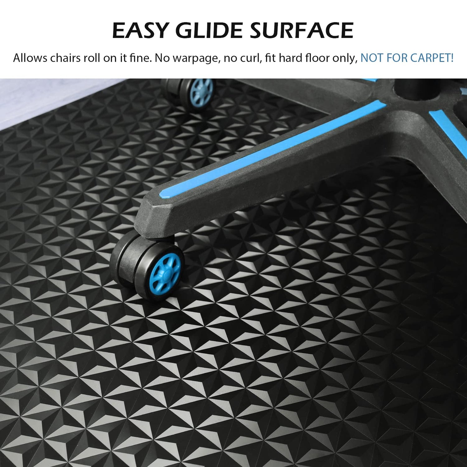 - GAMING CHAIR MAT FOR HARD FLOOR: The unique visual design of the 3D hexagram pattern helps to create a strong game atmosphere. However, the surface material is smooth and unobstructed in the sense of touch, which helps the chair move smoothly and effectively eliminates the noise made by the rolling of the casters. NOTE: This chair mat is only suitable for hard flooring, NOT FOR CARPET!!